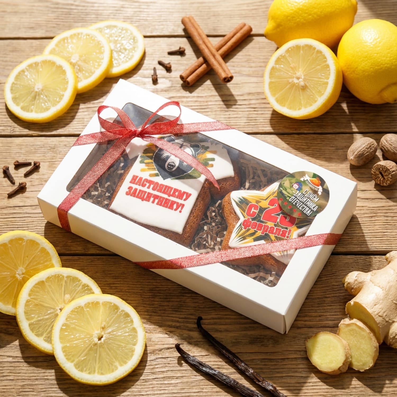 сахар белый, мёд натуральный, мука ржаная хлебопекарная обдирная, мука пшеничная хлебопекарная высший сорт, масло сливочное м.д.ж. 82,5%, яйца куриные, глюкозный сироп, регулятор кислотности (лимонная кислота), вода питьевая, добавка пищевая (гидрокарбонат натрия (сода пищевая)), лимоны свежие, краситель пищевой, корица, гвоздика, имбирь свежий, мускатный орех, ванилин