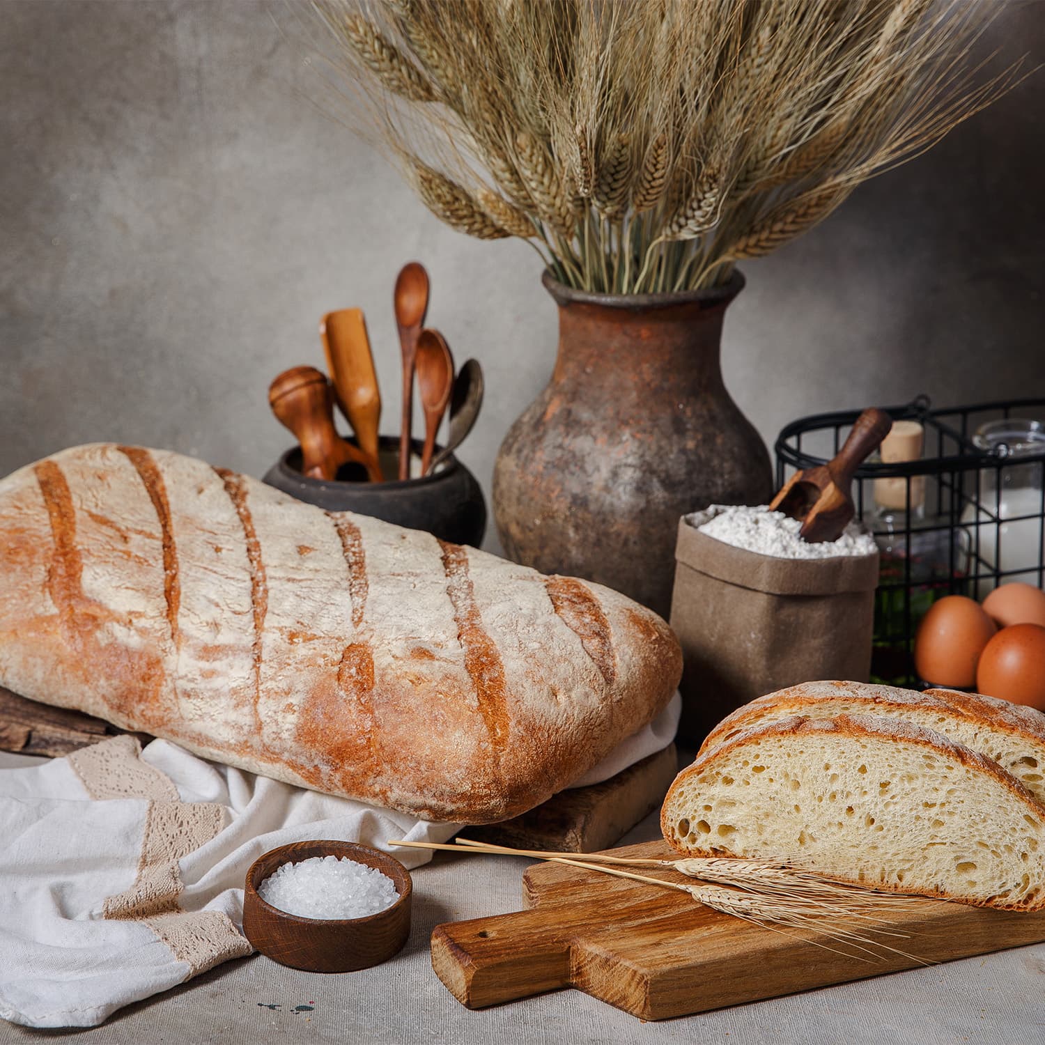 мука пшеничная хлебопекарная высший сорт, вода питьевая, мука пшеничная хлебопекарная крупчатка, масло оливковое, соль поваренная пищевая, дрожжи хлебопекарные, пряные травы(базилик,розмарин)