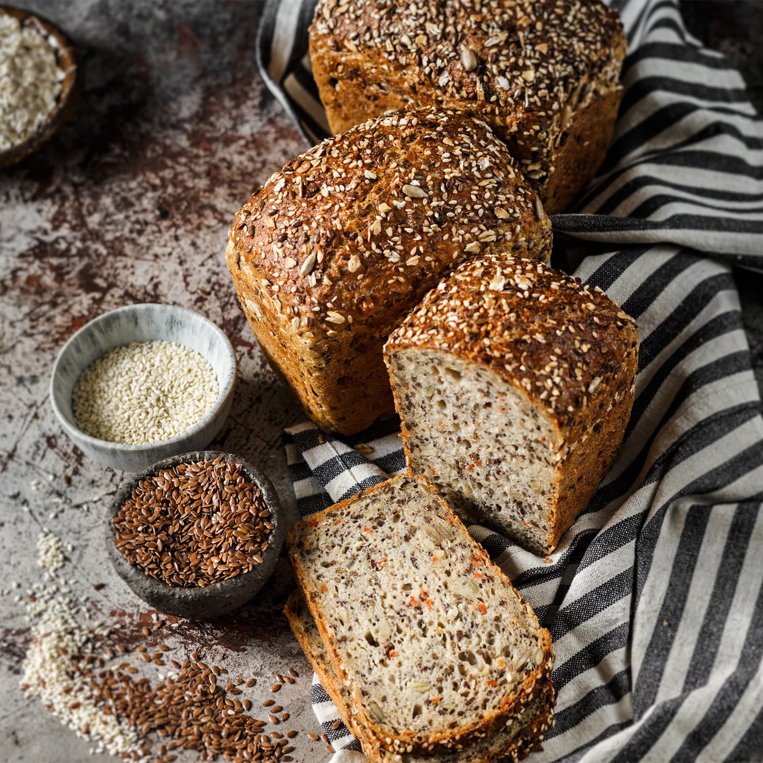 мука пшеничная хлебопекарная высший сорт, мука пшеничная хлебопекарная крупчатка, вода питьевая, семена льна, семена кунжута (белый), овсяные хлопья, семена подсолнечника, мука ржаная хлебопекарная обдирная, мука гречневая, морковь, семена тыквы, соль поваренная пищевая, мак пищевой