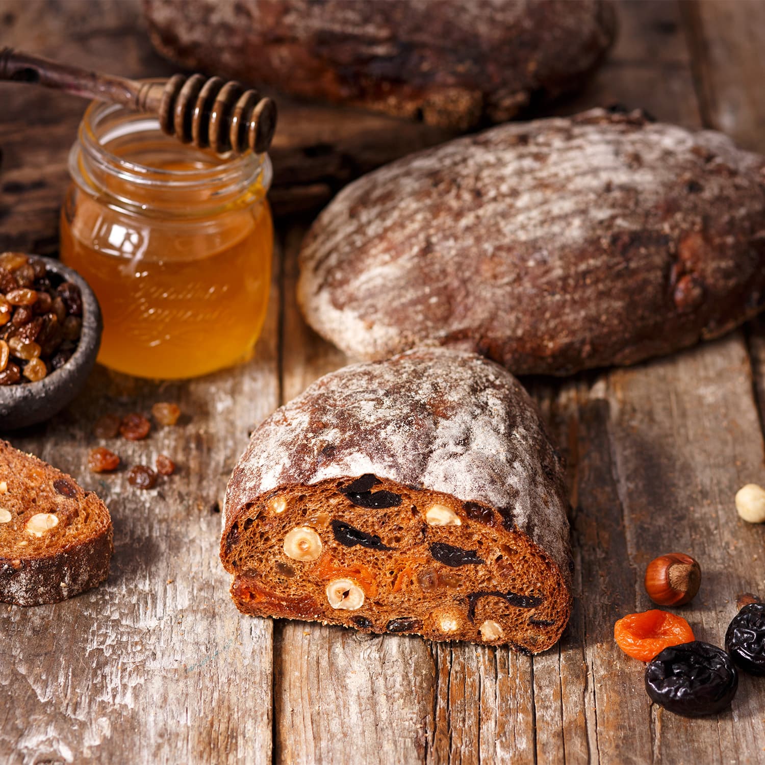 мука пшеничная хлебопекарная высший сорт, чернослив, курага, фундук, изюм, вода питьевая, мука ржаная хлебопекарная обдирная, дрожжи хлебопекарные, сахар белый, мёд натуральный, патока мальтозная, солод ржаной ферментированный, отруби пшеничные, соль поваренная пищевая