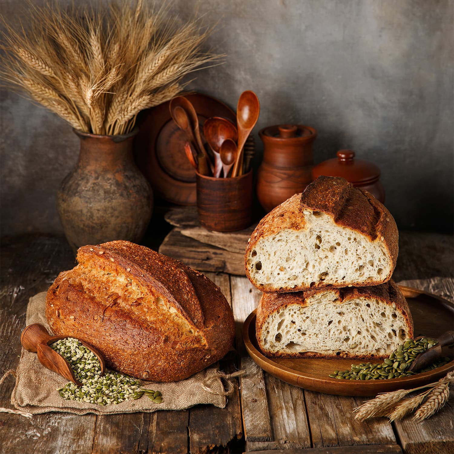 Вода питьевая, мука пшеничная хлебопекарная первый сорт, мука пшеничная хлебопекарная высший сорт, мука хлебопекарная пшеничная высокобелковая "Протелон" (пшеница), семена тыквы, мёд натуральный, мука пшеничная хлебопекарная цельнозерновая, семена чиа, семена конопли, масло подсолнечное рафинированное, соль поваренная пищевая, солод ячменный