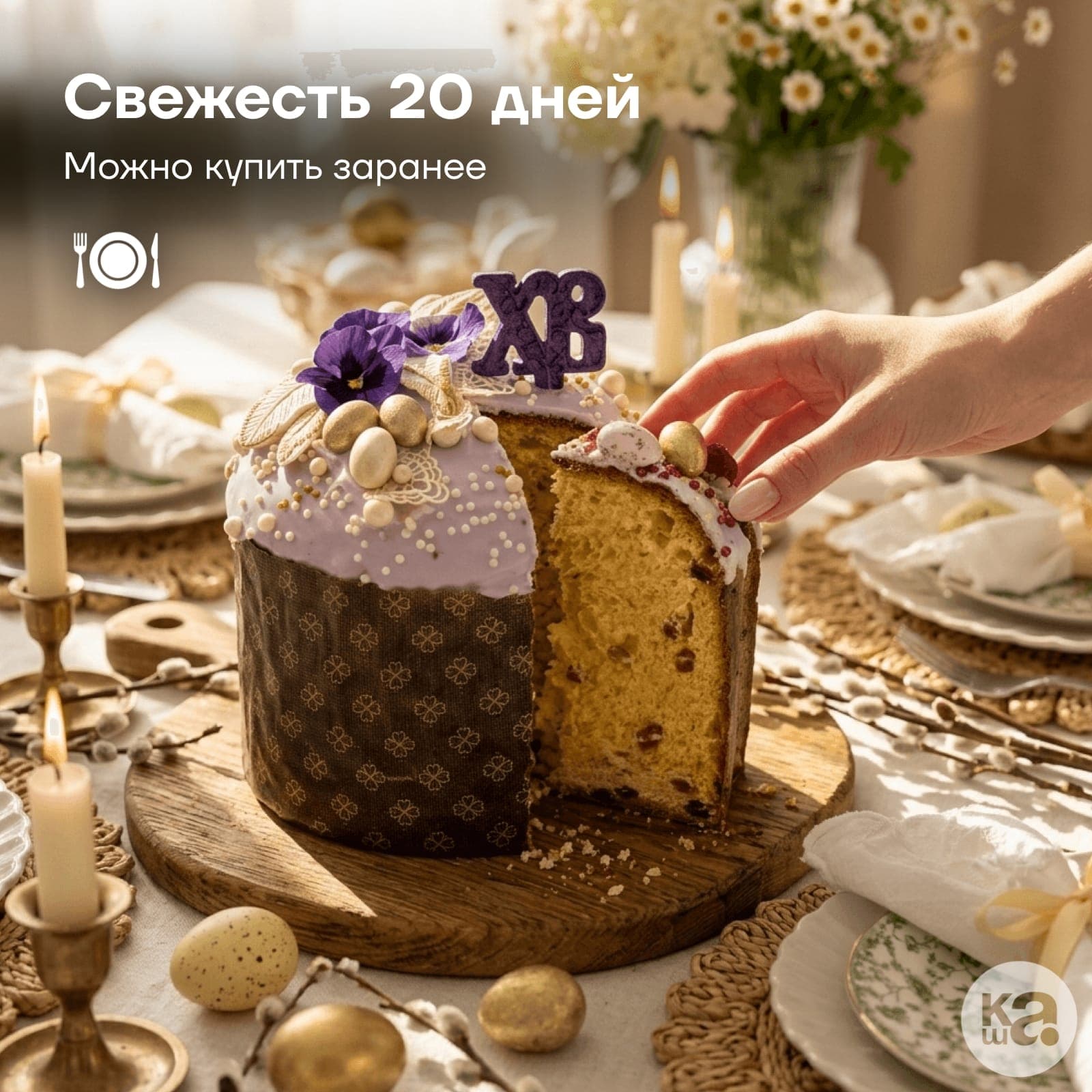 Дизайн поражает утонченностью: белоснежная помадка украшена тончайшим кондитерским кружевом и нежными сухоцветами виолы (анютиных глазок). Изящный леденец «ХВ» из изомальта и жемчужный миндаль в шоколаде превращают этот кулич в произведение кондитерского искусства.
