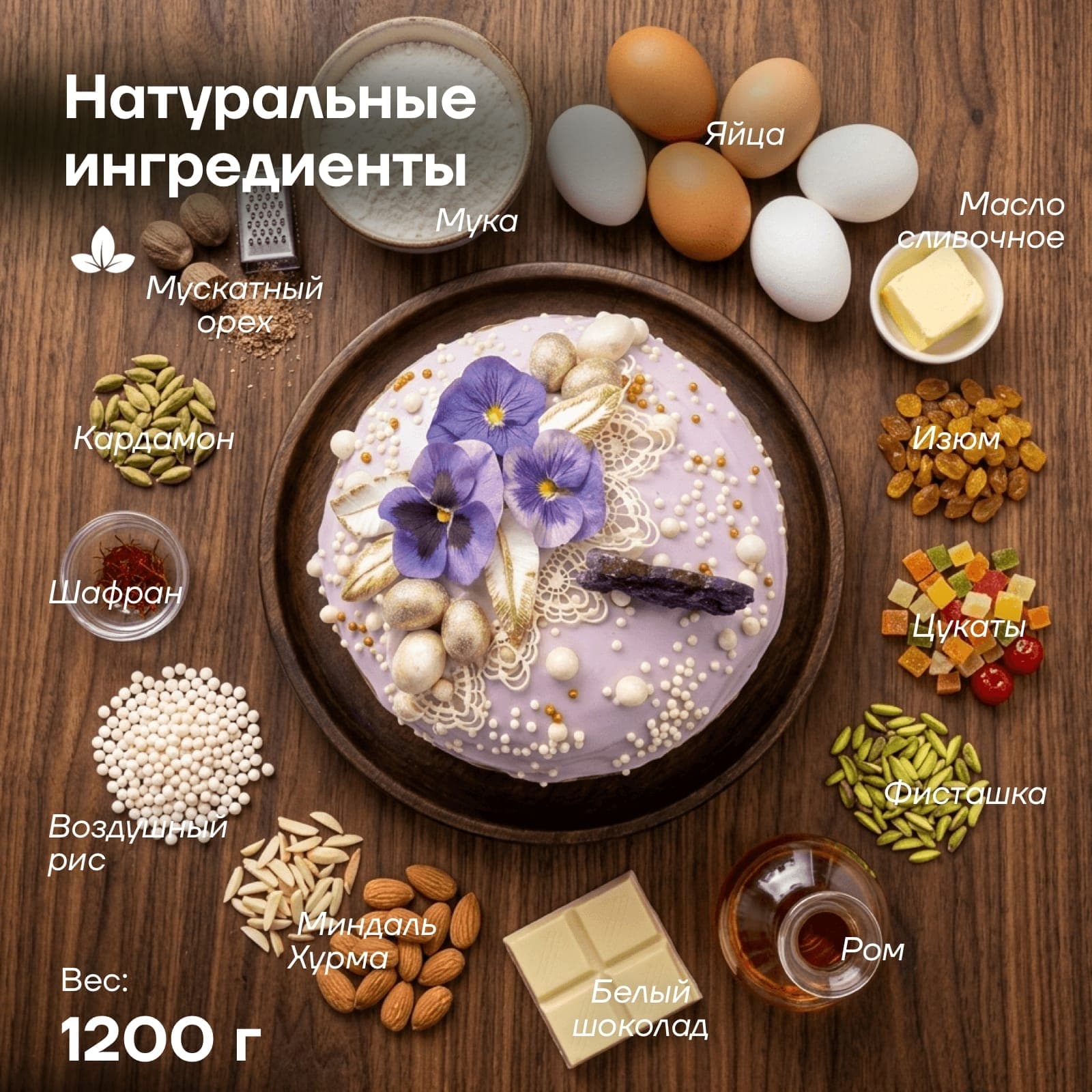Большой кулич для самого торжественного повода. Традиционное тесто на натуральном сливочном масле 82,5% обладает пористой структурой и насыщенным ароматом пряностей, рома и ванили с добавлением сочного изюма и цедры апельсина.
