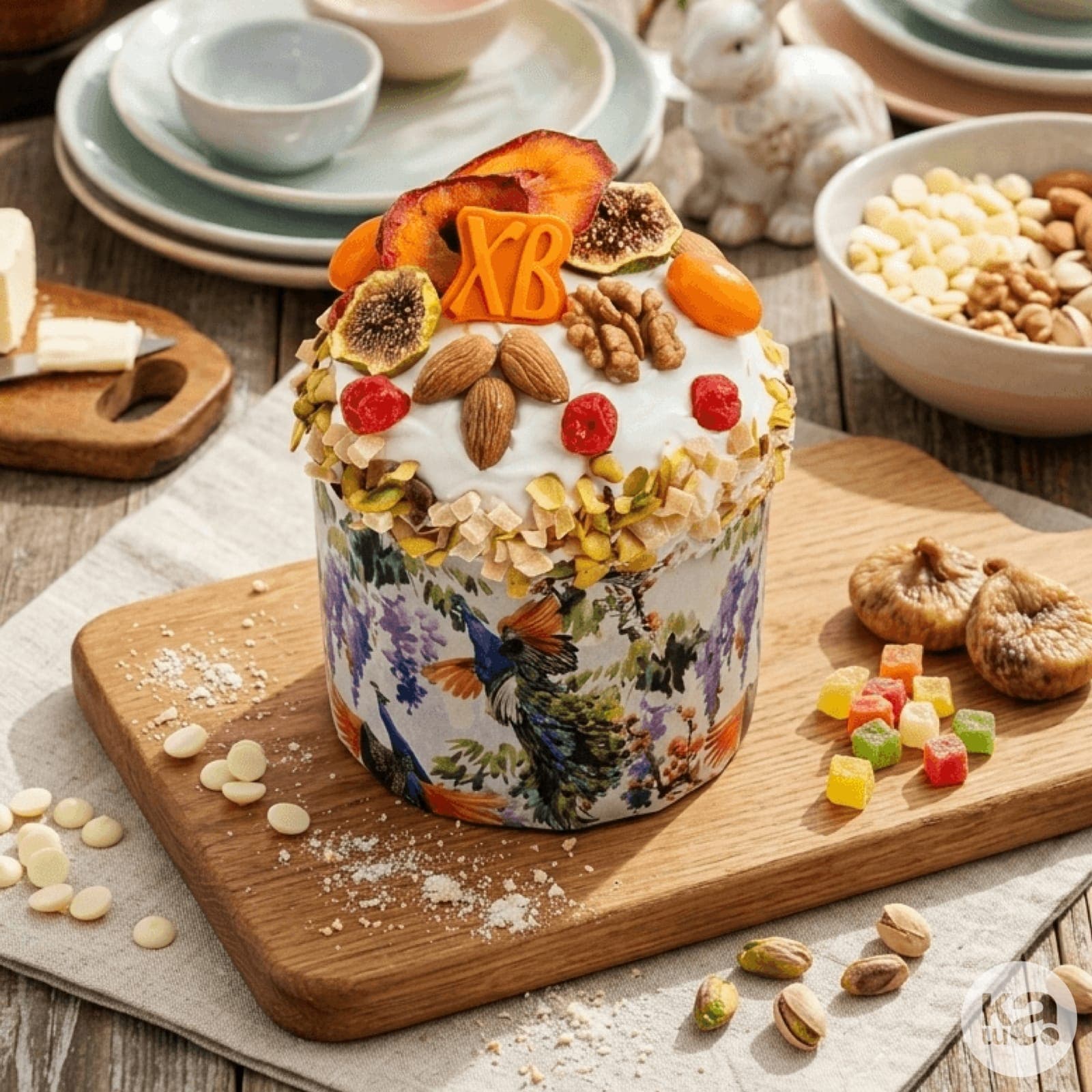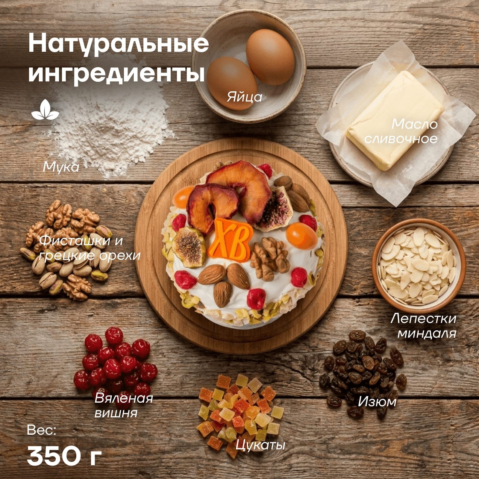 мука пшеничная хлебопекарная высший сорт, яйца куриные (желтки), помадка (сахар, глюкозный сироп, регулятор кислотности (кислота лимонная)), изюм, масло сливочное м.д.ж.82,5%, сахар белый, молоко питьевое м.д.ж. 3.2%, ядра миндаля, миндаль в шоколадной глазури (сахар, цельное сухое молоко, какао-масло, ядро миндаля жареное, патока, эмульгатор (лецитин), краситель пищевой), шоколад белый (сахар, какао-масло, молоко сухое цельное, эмульгатор (соевый лецитин), ароматизатор натуральный "Ваниль"), вяленая вишня, миндаль (лепестки), дрожжи хлебопекарные, цукаты (ананас), ядра орехов фисташки (лепестки), орех грецкий, цукаты апельсиновые (цедра апельсиновая, глюкозно-фруктовый сироп, сахар, регулятор кислотности: лимонная кислота), вода питьевая, инжир сушёный, украшения сахарные (сахар белый, патока, яичный белок, желатин, регулятор кислотности (лимонная кислота), краситель пищевой), ром, слива сушеная слайсы, соль поваренная пищевая, ванилин, шафран, мускатный орех, кардамон