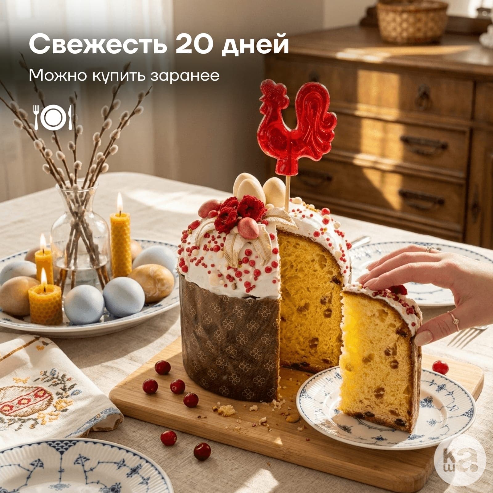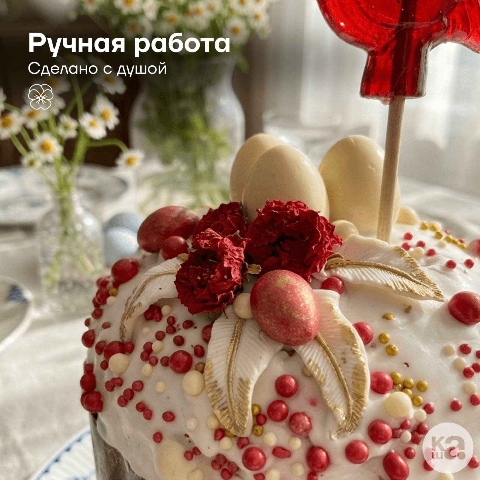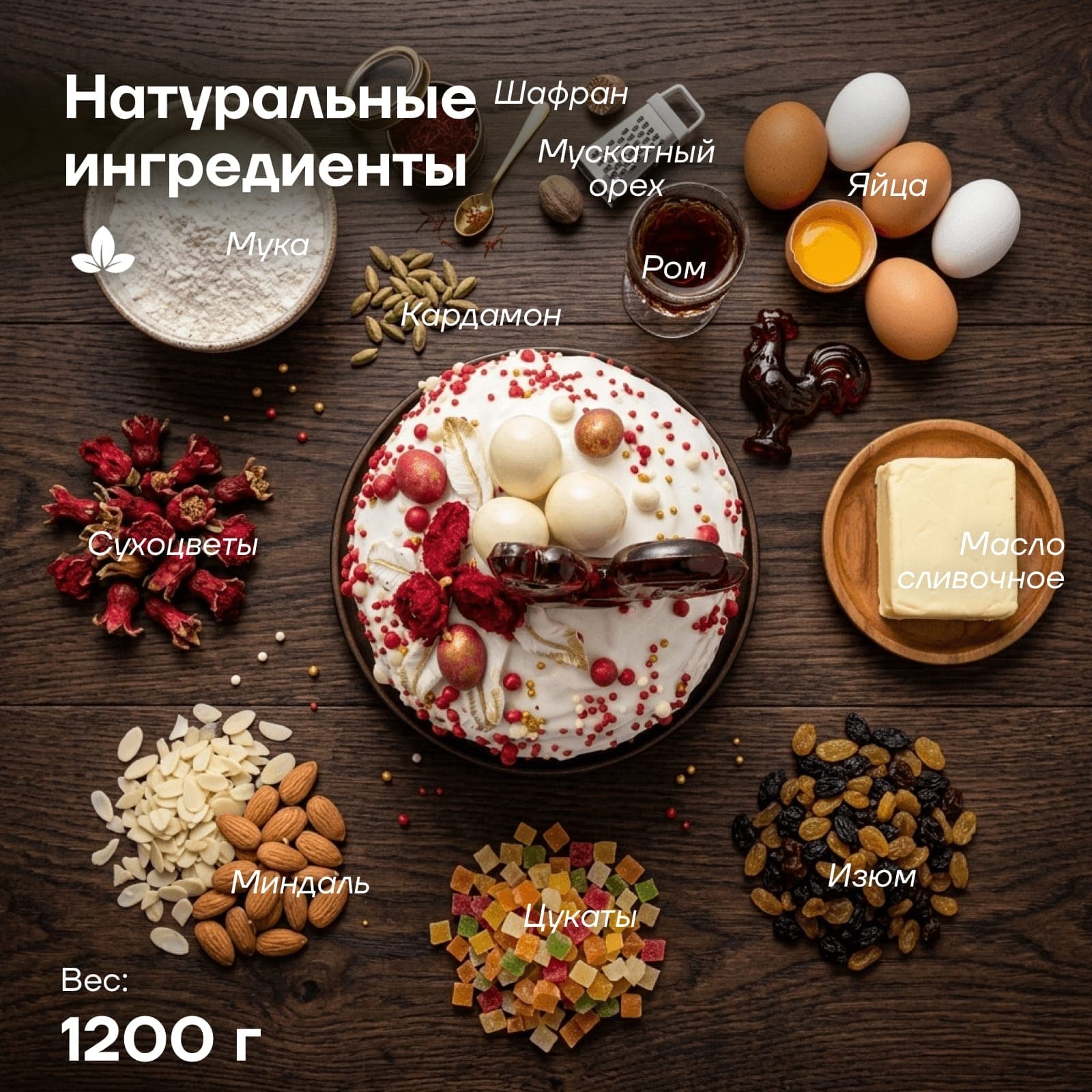 Роскошное оформление подчеркивает торжественность момента: белоснежная помадка украшена вяленой клубникой в йогурте, бутонами граната и миндалем в шоколадной глазури. Главный акцент — легендарный леденец «Петушок» на палочке, который превращает этот кулич в незабываемый пасхальный дар для всей семьи.