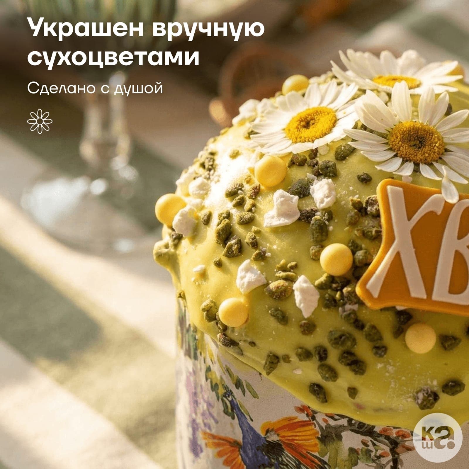 Главная особенность — изящное оформление настоящими сухоцветам ромашки и карамелизированной фисташковой крошкой на золотистой помадке. В сочетании с лепестками миндаля и белым шоколадом дизайн дарит ощущение цветущего весеннего луга и радует глаз своей естественной красотой.