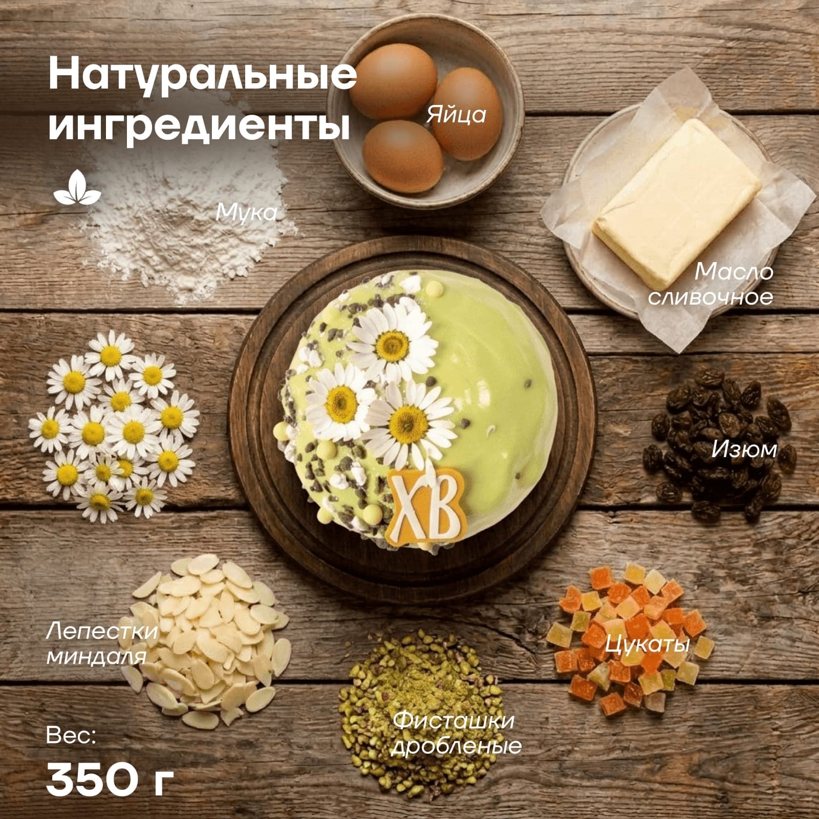 мука пшеничная хлебопекарная высший сорт, яйца куриные(желтки), помадка (сахар, глюкозный сироп, регулятор кислотности (кислота лимонная), краситель пищевой), изюм, масло сливочное м.д.ж.82,5%, сахар белый, молоко питьевое м.д.ж. 3.2%, шоколад белый (сахар, какао-масло, молоко сухое цельное, эмульгатор (соевый лецитин), ароматизатор натуральный "Ваниль"), миндаль (лепестки), дрожжи хлебопекарные, цукаты апельсиновые (цедра апельсиновая, глюкозно-фруктовый сироп, сахар, регулятор кислотности: лимонная кислота), вода питьевая, фисташка дробленая карамелизированная (фисташка 50% /сахар 50%), украшения сахарные (рис воздушный, какао-масло, патока, яичный белок, желатин, регулятор кислотности (лимонная кислота), краситель пищевой), ром, соль поваренная пищевая, ванилин, шафран, мускатный орех, кардамон, *украшения сухоцветы (ромашка)