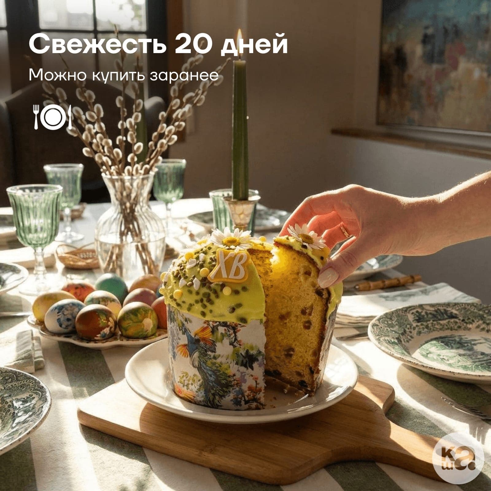 Традиционный кулич на основе традиционного сдобного теста с натуральным сливочным маслом 82,5%, отборным изюмом и ароматными апельсиновыми цукатами. Благодаря добавлению шафрана, мускатного ореха и кардамона мякиш обладает благородным пряным вкусом и нежной текстурой, а капля рома делает аромат по-настоящему праздничным.