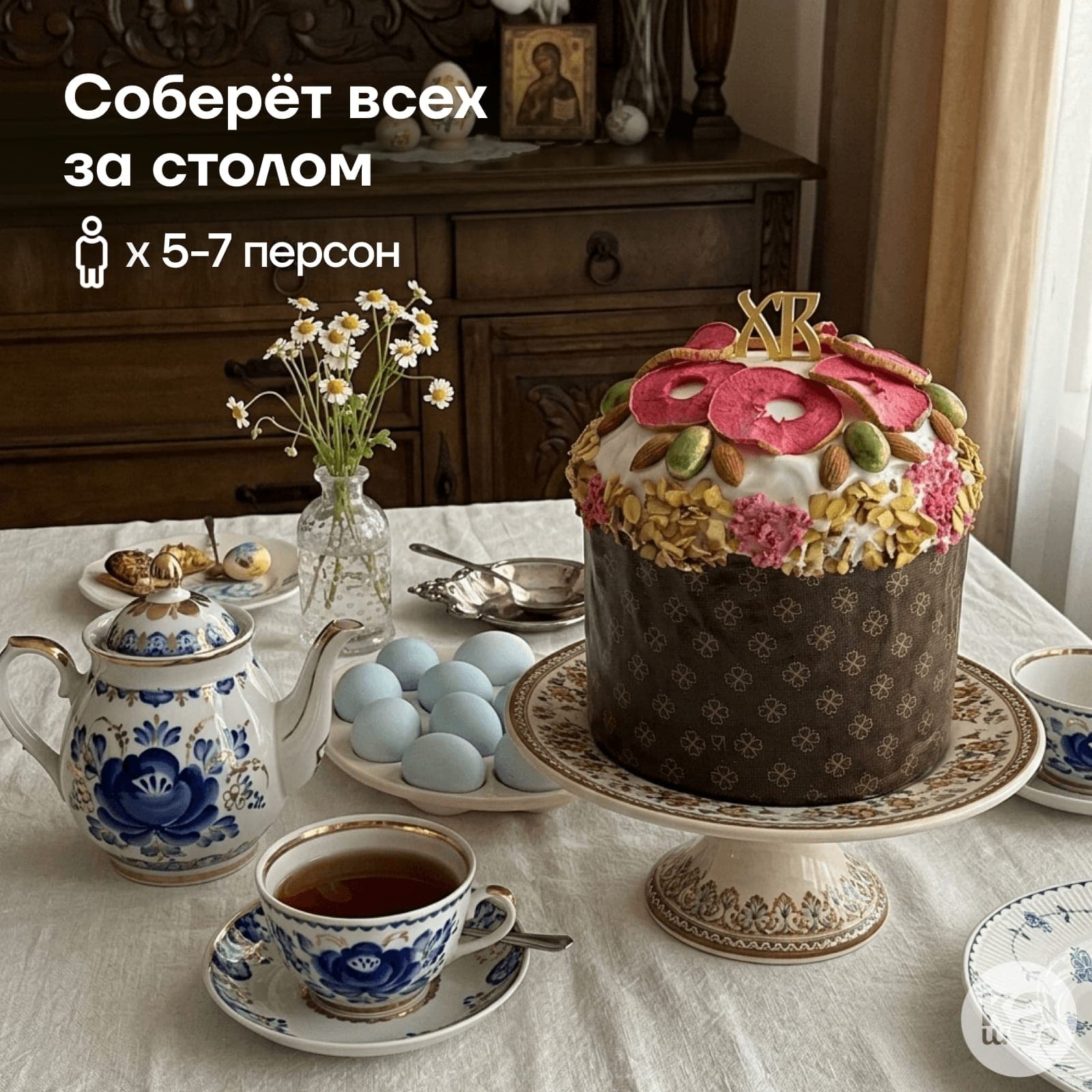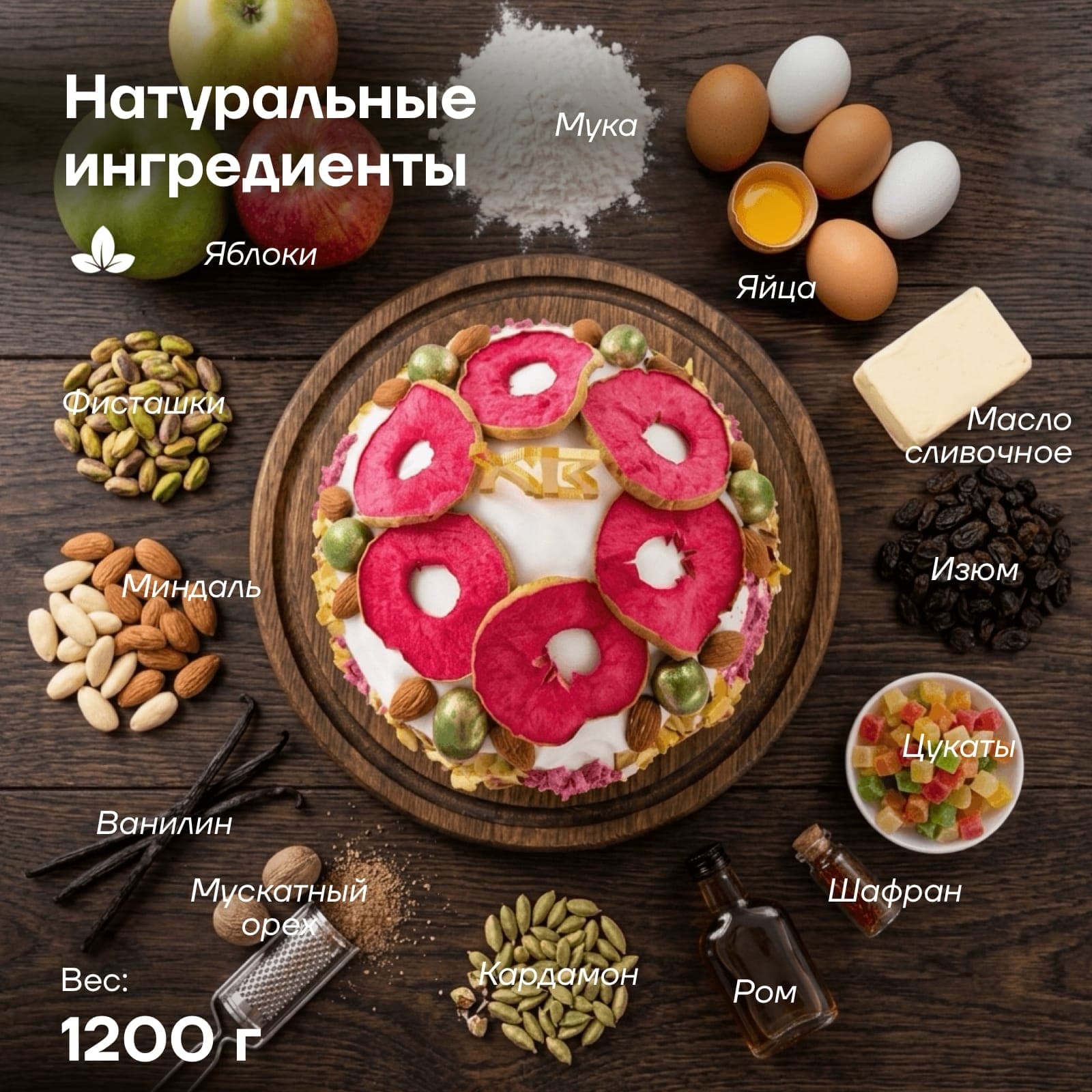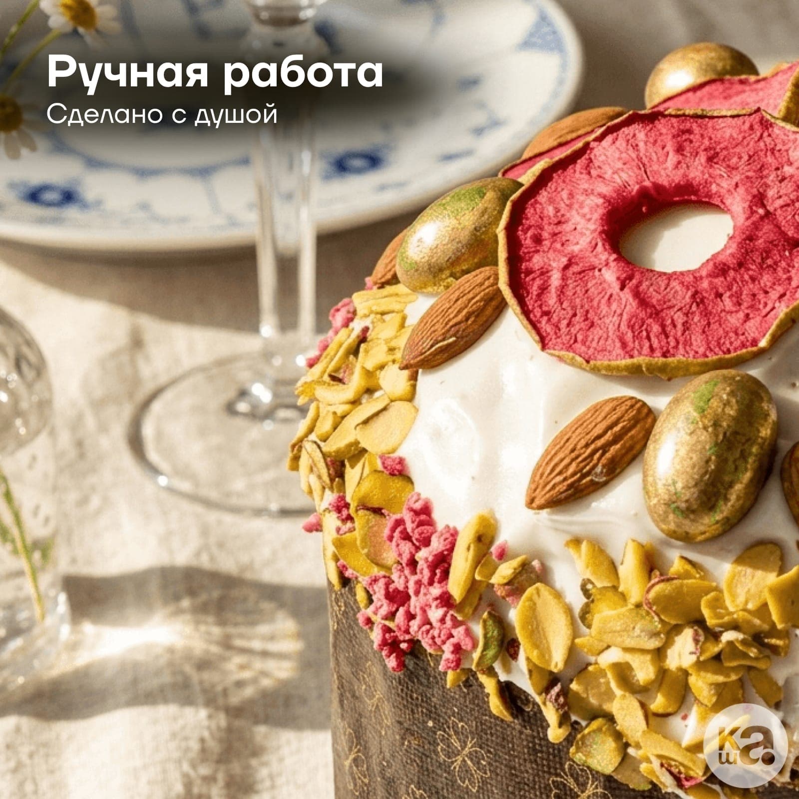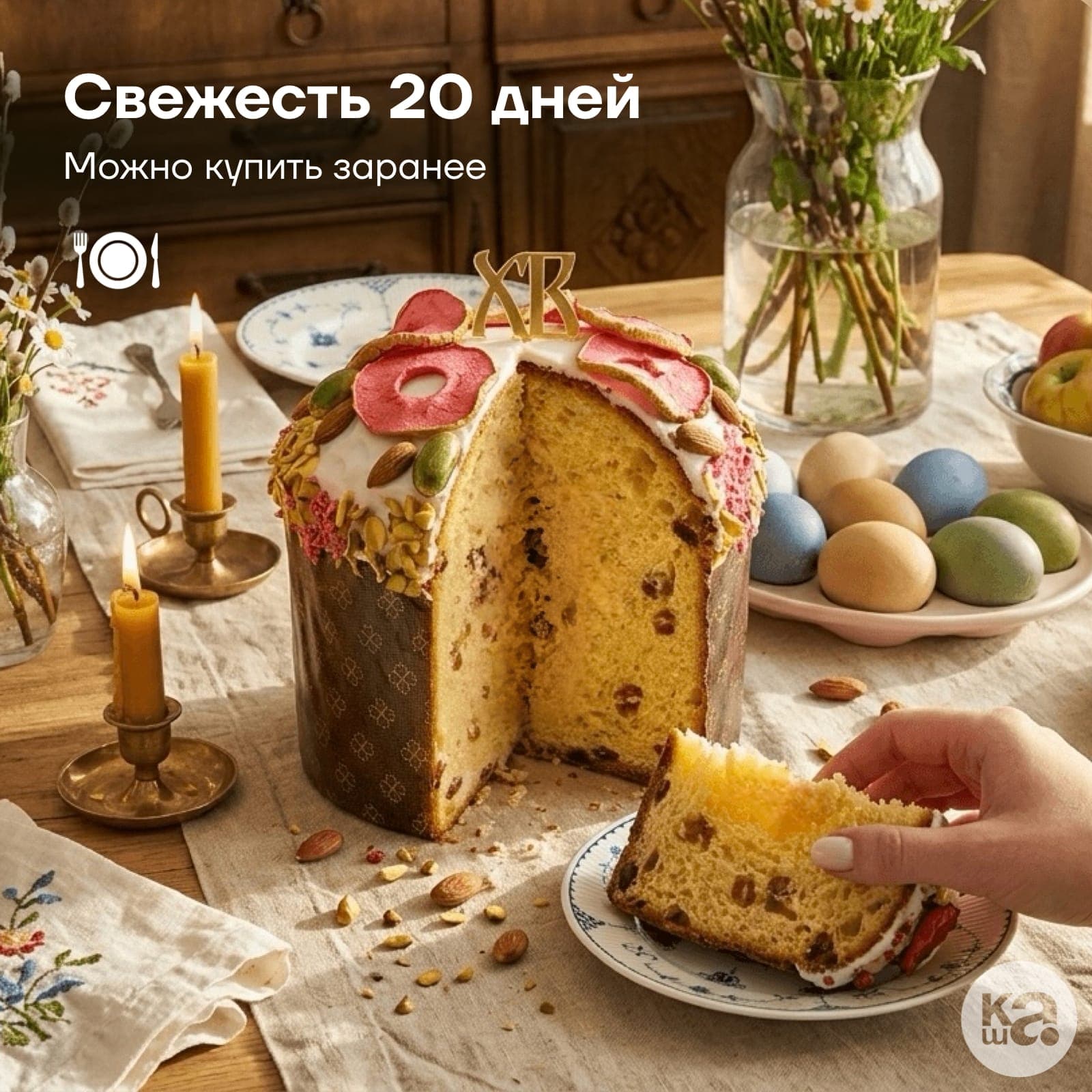 Верхушку кулича венчает настоящий «хоровод» из розовых слайсов сушеного яблока, цельных ядер миндаля и изумрудной фисташки. Особую изысканность декору придают натуральные лепестки роз в сахаре и торжественный золотистый топпер «ХВ», превращая кулич в главное украшение праздничного стола.