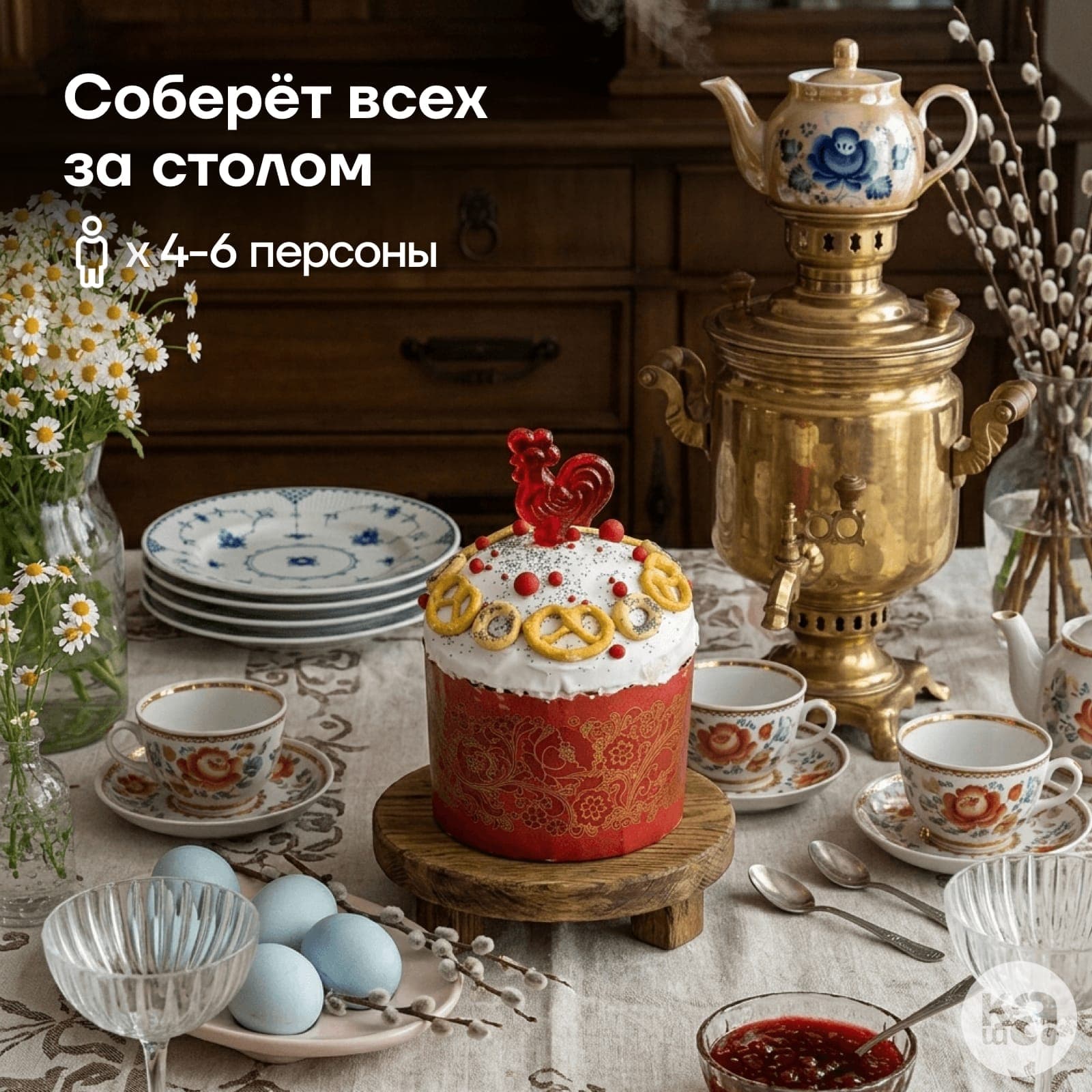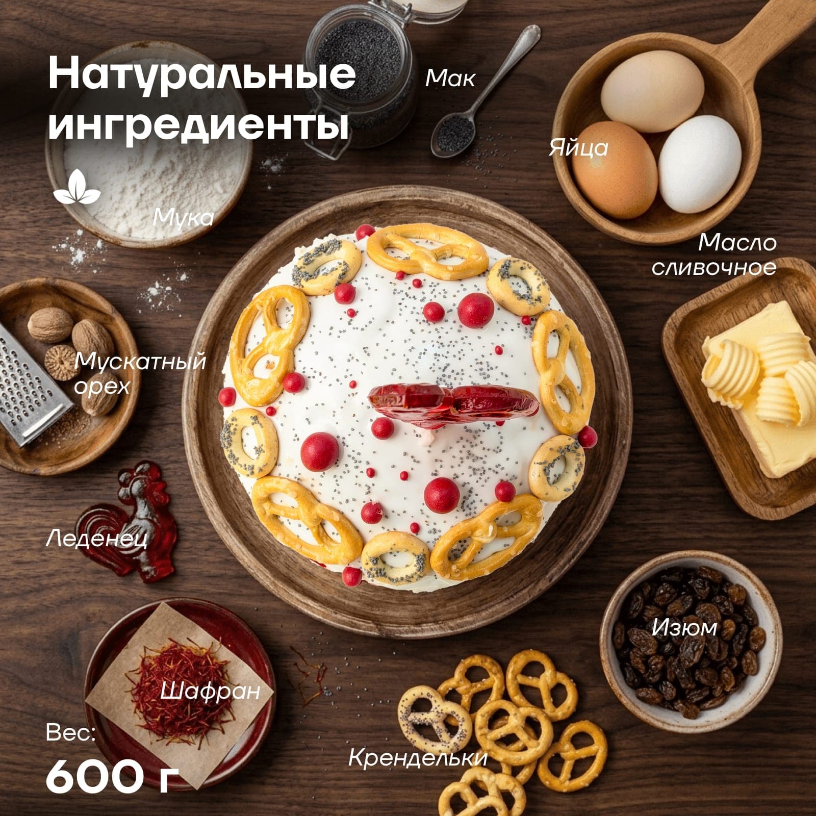 мука пшеничная хлебопекарная высший сорт, яйца куриные (желтки), помадка (сахар, глюкозный сироп, регулятор кислотности (кислота лимонная)), изюм, масло сливочное м.д.ж.82,5%, сахар белый, молоко питьевое м.д.ж. 3.2%, миндаль (лепестки), дрожжи хлебопекарные, изделия хлебобулочные крендели с солью (мука пшеничная хлебопекарная высшего сорта, вода, масло подсолнечное, соль, соль морская, дрожжи хлебопекарные, регулятор кислотности (лимонная кислота), солод ячменный, разрыхлители: гидрокарбонат аммония, гидрокарбонат натрия), украшения сахарные (рис воздушный, какао-масло, патока, яичный белок, желатин, регулятор кислотности (лимонная кислота), краситель пищевой), карамель леденцовая Петушок (сахар, мёд, вода, краситель пищевой), цукаты апельсиновые (цедра апельсиновая, глюкозно-фруктовый сироп, сахар, регулятор кислотности: лимонная кислота), вода питьевая, изделия хлебобулочные бараночные мини-сушки с маком (мука пшеничная хлебопекарная высшего сорта, вода, масло растительное, сахар, мак пищевой, соль, дрожжи хлебопекарные, регулятор кислотности (лимонная кислота)), ром, соль поваренная пищевая, мак пищевой, ванилин, шафран, мускатный орех, кардамон