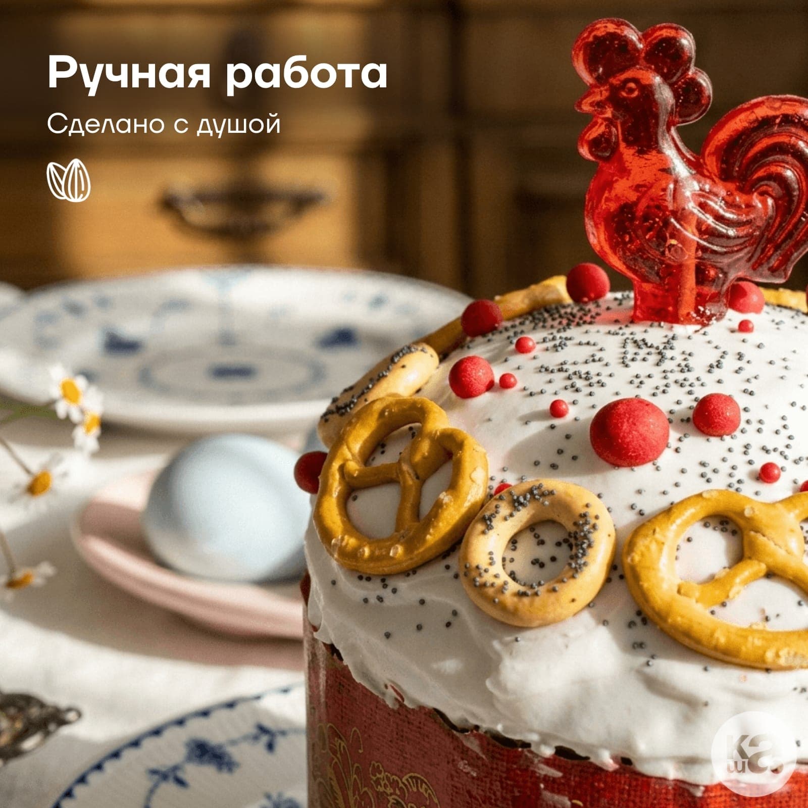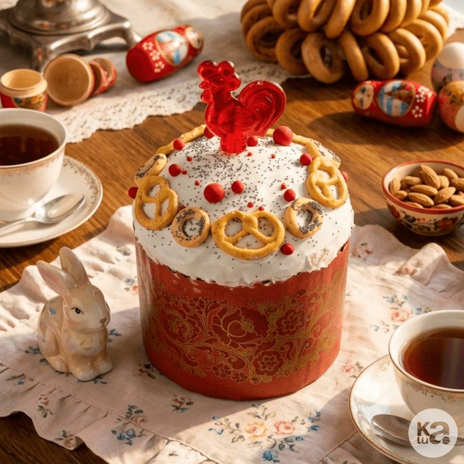 Дизайн в стиле народных гуляний привлекает внимание: на помадке красуются миниатюрные сушки с маком, крендельки и знаменитый леденец «Петушок». Оригинальное оформление с маком и миндалем создаст неповторимую атмосферу русской ярмарки на вашем столе.