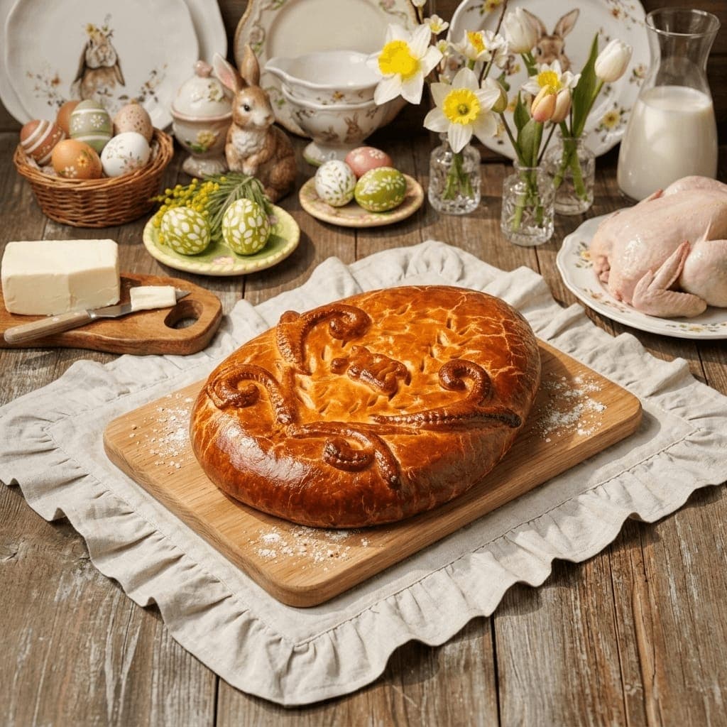 Ароматный и нежный пирог, форма которого символизирует жизнь и весеннее обновление. Начинка из сочного куриного филе дополнена мягким тестом, поверхность которого венчает праздничный орнамент с буквами «ХВ» и колосьями. Глянцевая корочка выпечки подчеркивает каждую деталь ручной работы.