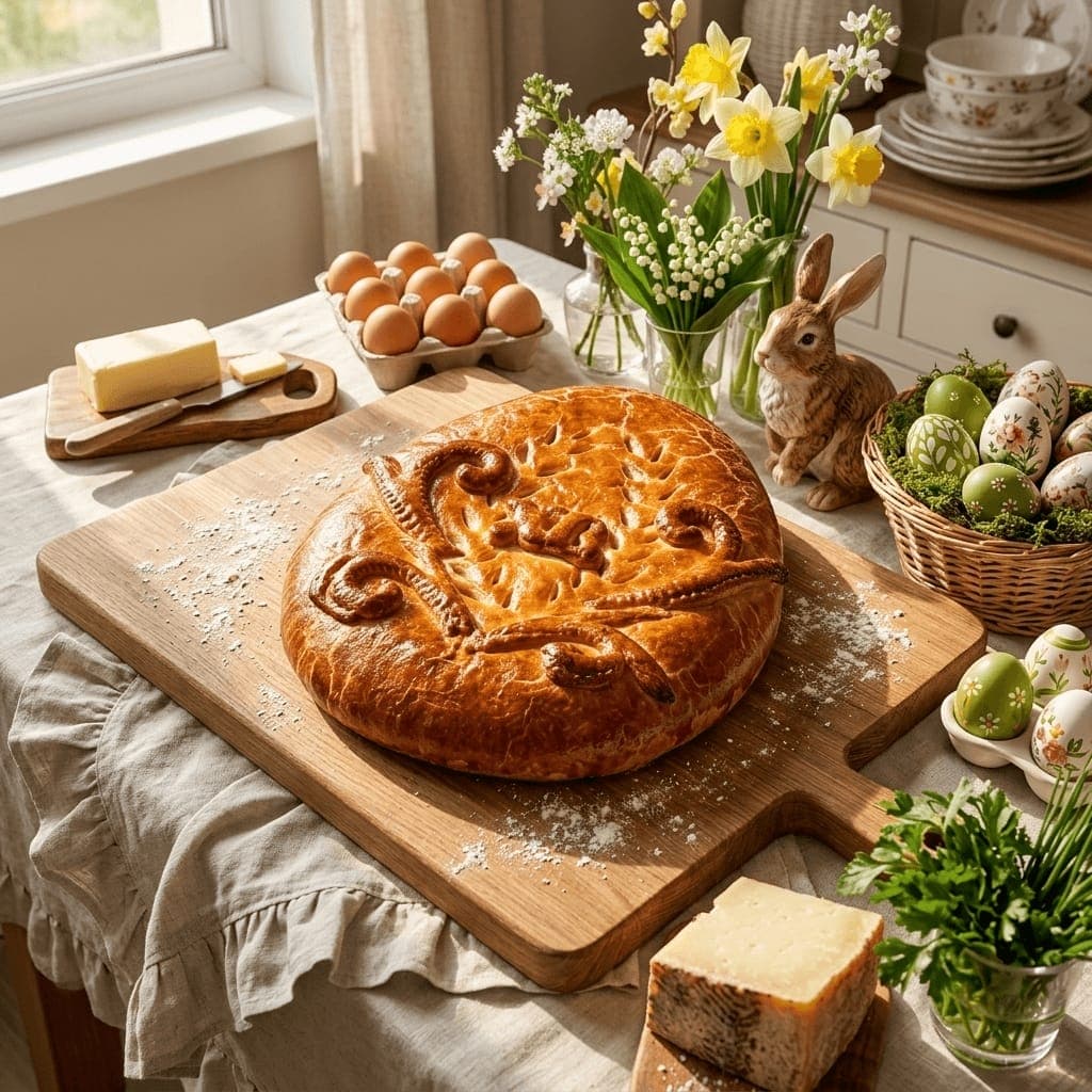 Яркая весенняя начинка из сыра, фермерских яиц и свежей зелени в нарядной праздничной форме. Форма пасхального яйца и центральный элемент декора в виде букв «ХВ» делают этот пирог не просто выпечкой, а настоящим символом торжества. Филигранная лепка из теста превращает его в эстетичный центр праздничной сервировки.