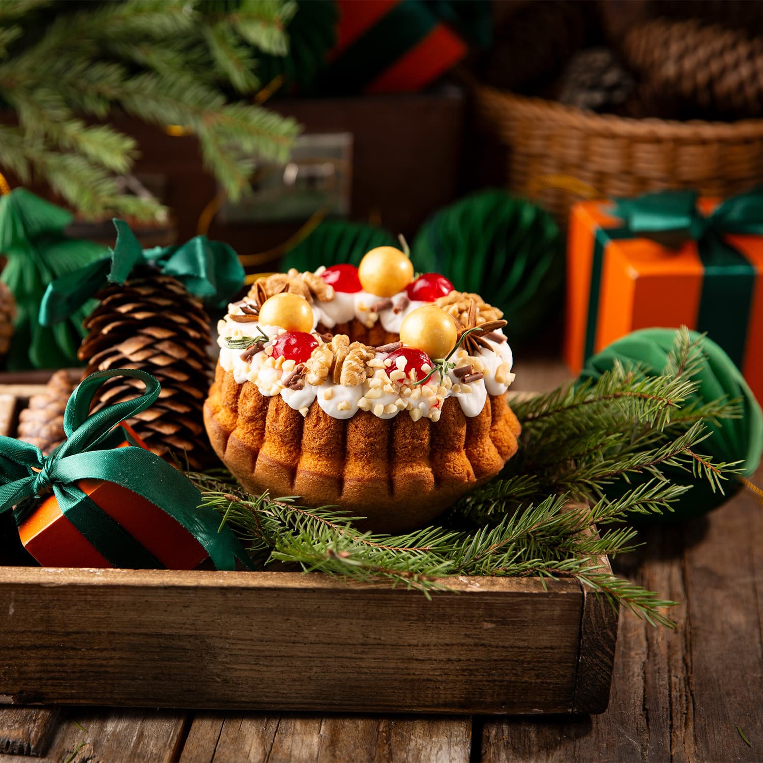 помадка (сахар, глюкозный сироп, регулятор кислотности (кислота лимонная)), мука пшеничная хлебопекарная высший сорт, сахар белый, яйца куриные, масло сливочное м.д.ж. 82,5%, вода питьевая, смесь кондитерская для кексов (мука пшеничная хлебопекарная высший сорт, сахар, сыворотка молочная сухая, разрыхлитель (гидрокарбонат натрия (сода пищевая)), регулятор кислотности (кислота лимонная)), драже фундук (шоколадная глазурь белая (сахар, какао-масло, молоко цельное сухое эмульгатор (соевый лецитин), натуральный ароматизатор-ванилин, краситель пищевой, ядро фундука жареное)), масло подсолнечное рафинированное, орех грецкий, арахис, вишня засахаренная, бадьян (звёздочки), розмарин свежий, соль поваренная пищевая, добавка пищевая (гидрокарбонат аммония), ванилин, краситель пищевой