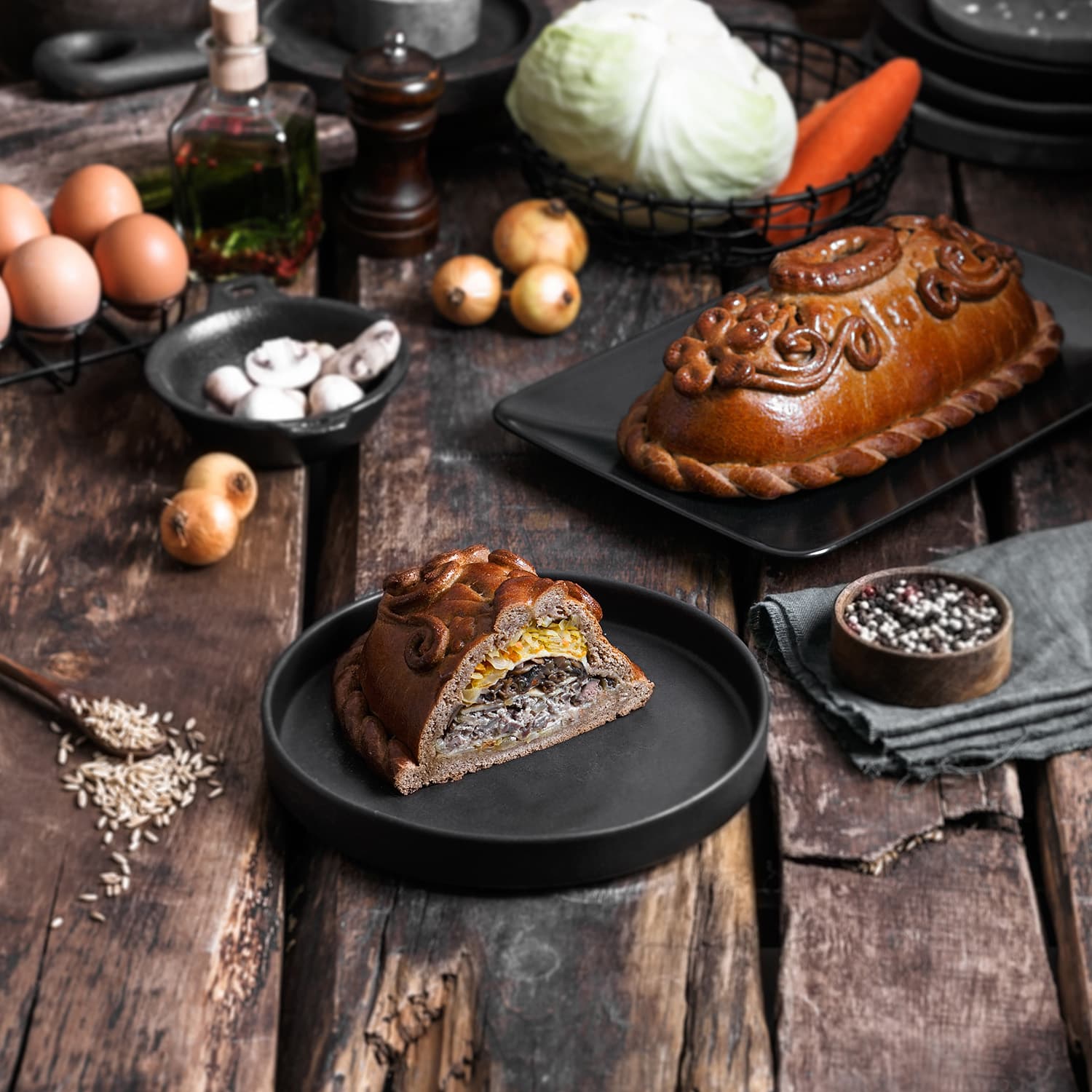 грибы шампиньоны, мука ржаная хлебопекарная обдирная, лук репчатый, капуста свежая, печень куриная, сердце куриное, желудочки куриные, молоко питьевое м.д.ж. 3.2%, масло сливочное м.д.ж.82,5%, масло оливковое, мука пшеничная хлебопекарная высший сорт, морковь свежая, сахар белый, яйца куриные, дрожжи хлебопекарные, соль поваренная пищевая, корень( пастернака,петрушки,сельдерея), чеснок, паприка(зелёная, красная), петрушка, перец красный, майоран, тимьян, укроп, солод ржаной ферментированный