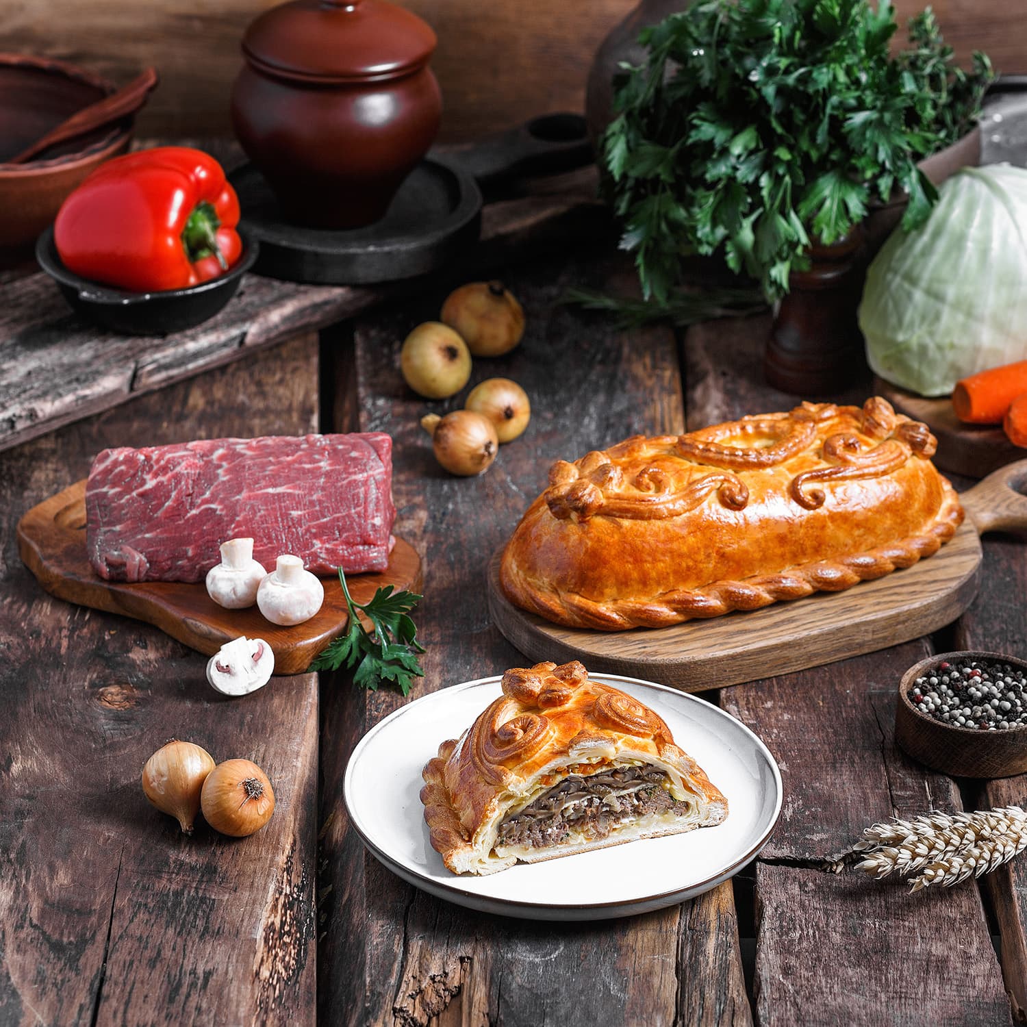 грибы шампиньоны, мука пшеничная хлебопекарная высший сорт, молоко питьевое м.д.ж. 3.2%, мясо (говядина), лук репчатый, капуста свежая, масло сливочное м.д.ж.82,5%, яйца куриные, масло оливковое, морковь свежая, сметана м.д.ж.20%, сахар белый, соль поваренная пищевая, дрожжи хлебопекарные, петрушка свежая, корень( пастернака,петрушки,сельдерея), чеснок, паприка(зелёная, красная), перец красный, майоран, тимьян, укроп, перец черный