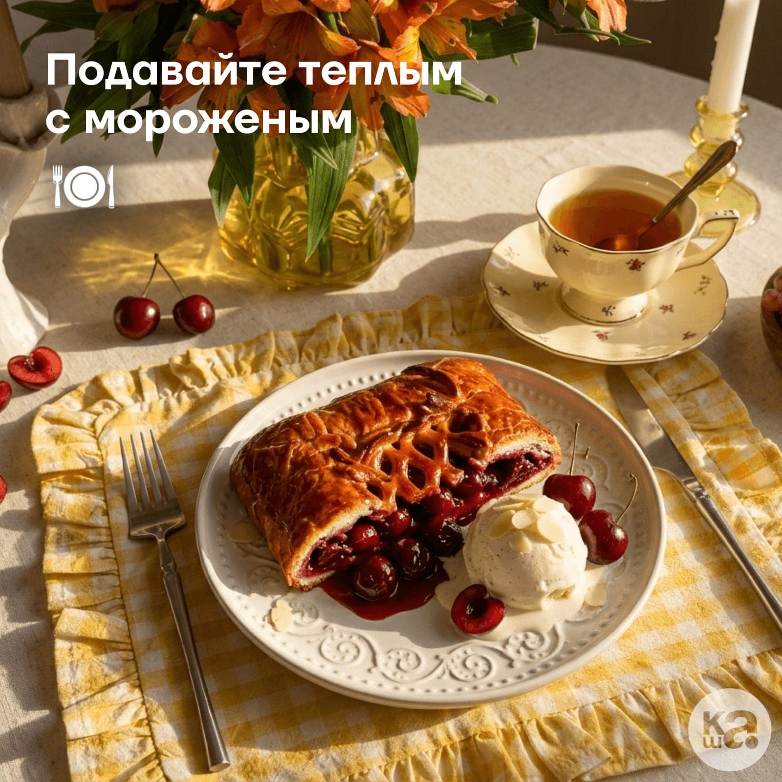 Тонкое и нежное тесто на натуральном сливочном масле и свежей сметане, буквально тает во рту, дополняя вишневое изобилие.
