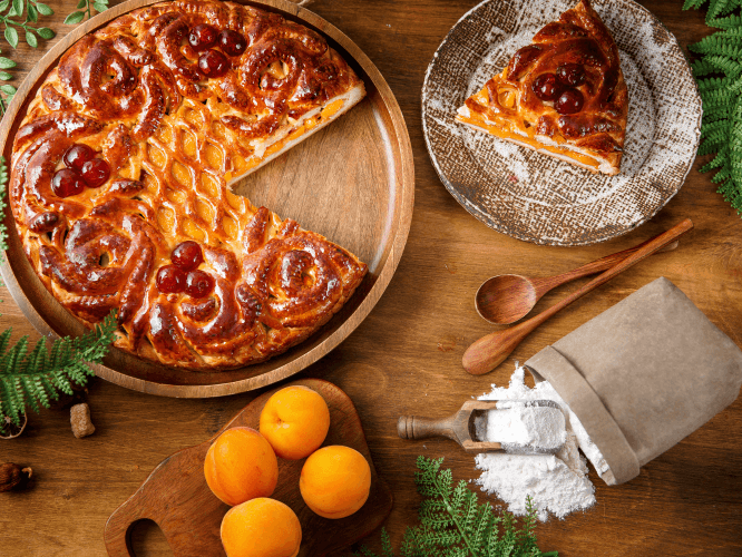 Солнечное настроение на вашем столе! Сочная начинка из абрикосов скрыта под румяной корочкой с красивым рельефным узором и ажурным плетением в центре, сквозь которое просматривается золотистая начинка. Нежное дрожжевое тесто на сливочном масле и сметане идеально дополняет фруктовое наполнение, а нотки ванили придают аромату особую теплоту. Вишенки в узоре добавляют десерту праздничный и завершённый вид. Этот пирог станет ярким акцентом праздничного застолья или уютного семейного чаепития.