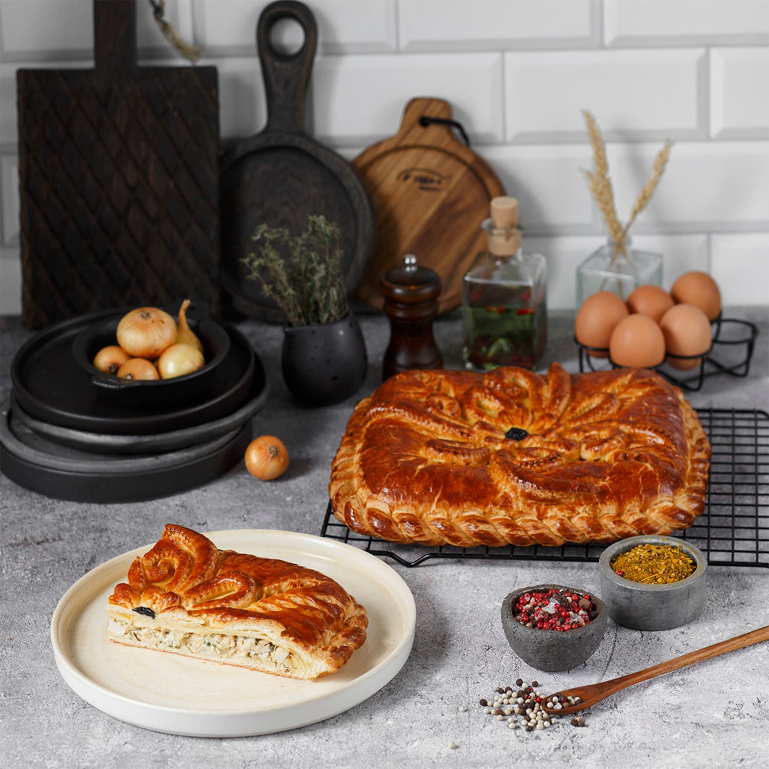 Продукция «Каравай-СВ». Отправьтесь в кулинарное путешествие по просторам России с ароматным пирогом «Русские узоры» с сочной курицей. Вас ждет настоящий праздник вкуса! Выпечка с аппетитной золотистой корочкой привлекает внимание нарядным цветочным узором и обрамлением из витой косички, которые напоминают родные сердцу народные промыслы. Нежное филе курицы, тушенное с луком и сыром, раскрывается богатым букетом пряностей: теплые ноты кориандра и тмина, легкая острота красного перца, пикантность чеснока и тонкий аромат хмели-сунели создают сложный, согревающий вкус, который порадует ваших близких. Пышное тесто на сливочном масле и сметане впитывает соки начинки, становясь невероятно вкусным, но сохраняя при этом структуру.
