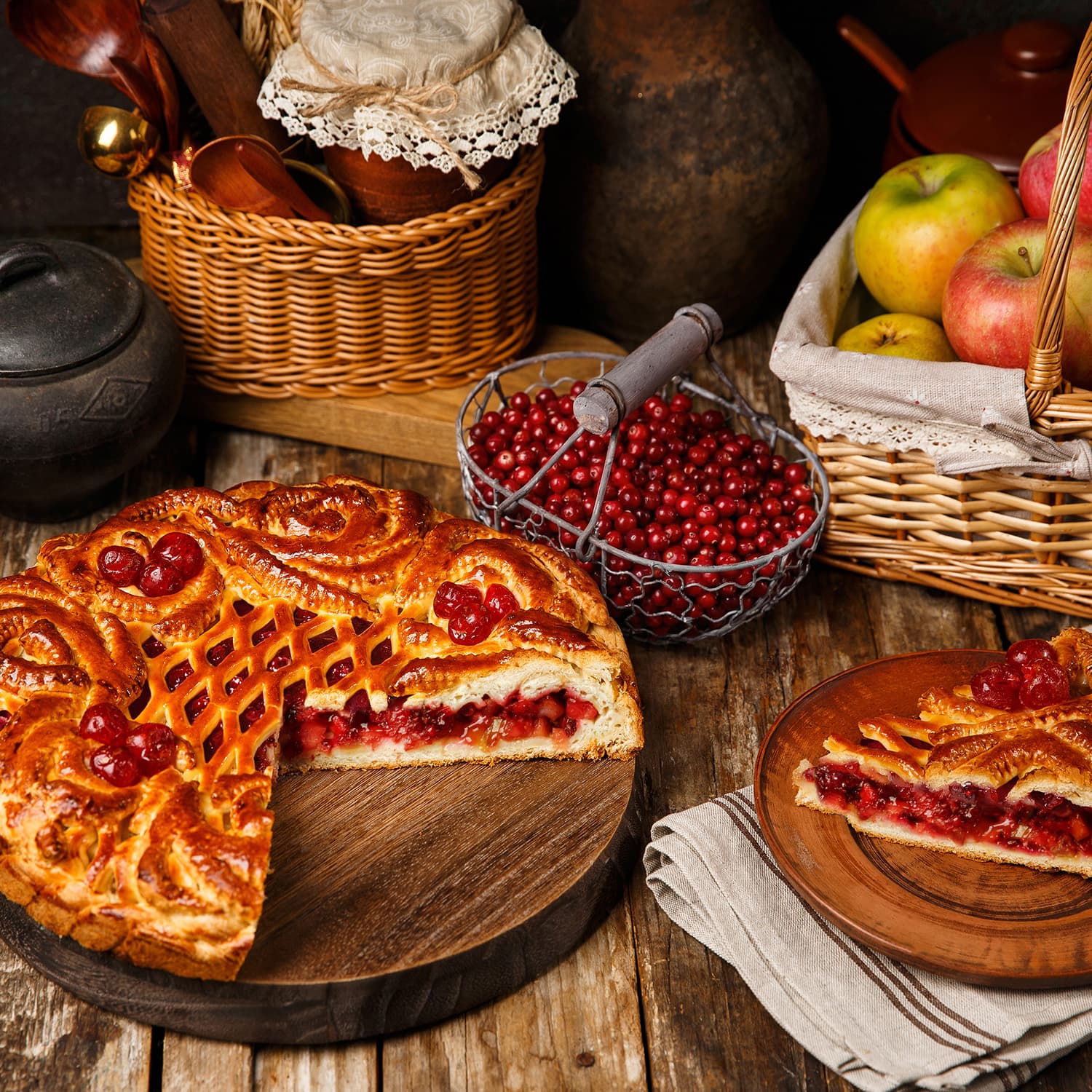 Традиционное десертное блюдо с многогранным вкусом и праздничным оформлением. Его квадратная форма украшена цветочным узором ручной лепки. В центре — ажурная сеточка, сквозь которую просматривается рубиново-красная начинка. Вас ждёт сладкая симфония вкусов: нежные дольки запечённых яблок, тающие во рту, оттеняет яркая брусника с освежающей кислинкой. Каждый кусочек — это баланс между медовой сладостью, лёгкой терпкостью и ванильным ароматом. Яркие засахаренные вишенки в декоре добавляют десерту завершённый вид.