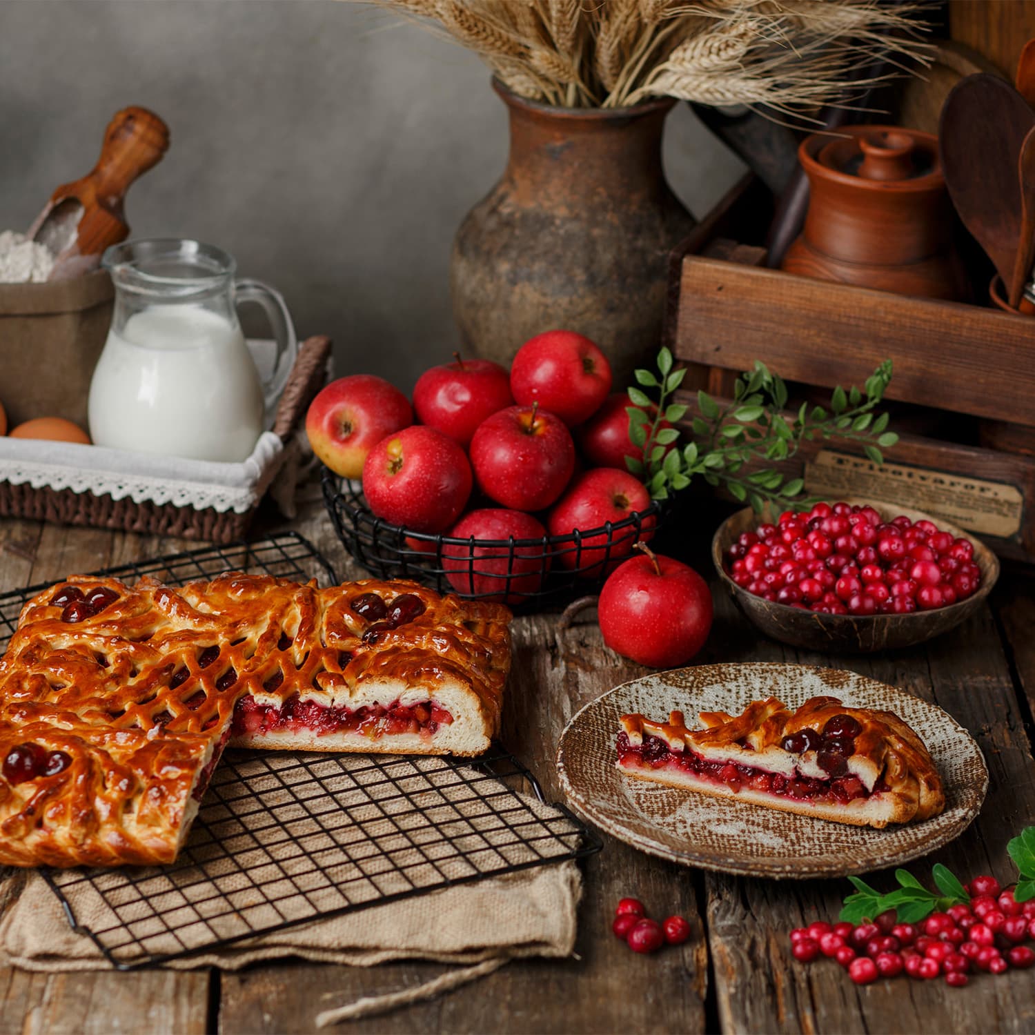 Продукция «Каравай-СВ». Пирог «Русские узоры» с яблоками и брусникой — традиционное десертное блюдо с многогранным вкусом и праздничным оформлением. Его квадратная форма украшена цветочным узором ручной лепки. В центре поместилась ажурная сеточка, сквозь которую приятно полюбоваться рубиново-красной ягодной начинкой, обещающей настоящее гастрономическое приключение. Вас ждет сладкая симфония вкусов: нежные дольки запеченных яблок, тающие во рту, оттеняет яркая брусника с освежающей кислинкой. Каждый кусочек — баланс между медовой сладостью, легкой терпкостью и ванильным ароматом. Сдобное тесто на сливочном масле и сметане завершает эту гармонию. Большой пирог весом 1,3 кг станет звездой любой сладкой трапезы.