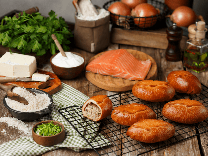 мука пшеничная хлебопекарная высший сорт, сёмга охлажденная, лук репчатый, сметана м.д.ж.20%, яйца куриные, масло подсолнечное рафинированное, молоко питьевое м.д.ж.3,2%, петрушка свежая, сахар белый, дрожжи хлебопекарные, соль поваренная пищевая, перец паприка
