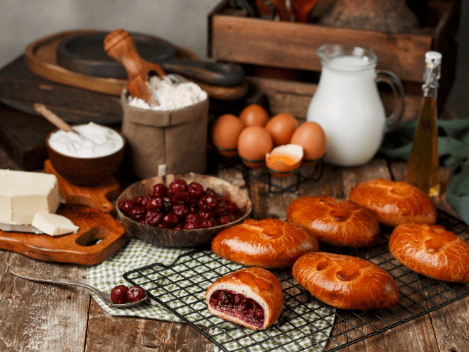 вишня быстрозамороженная, мука пшеничная хлебопекарная высший сорт, сахар белый, масло сливочное м.д.ж.82,5%, яйца куриные(желтки), молоко питьевое м.д.ж.3,2%, сметана м.д.ж.20%, масло оливковое, дрожжи хлебопекарные, соль поваренная пищевая, ванилин