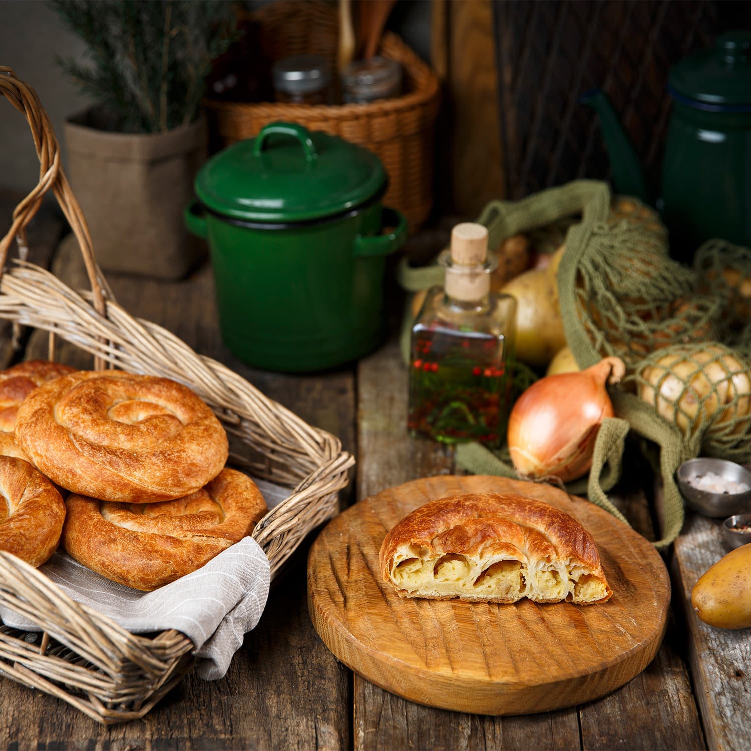 картофель свежий, мука пшеничная хлебопекарная высший сорт, масло подсолнечное рафинированное, вода питьевая, лук репчатый, мёд натуральный, сахар белый, соль поваренная пищевая, дрожжи хлебопекарные, перец черный