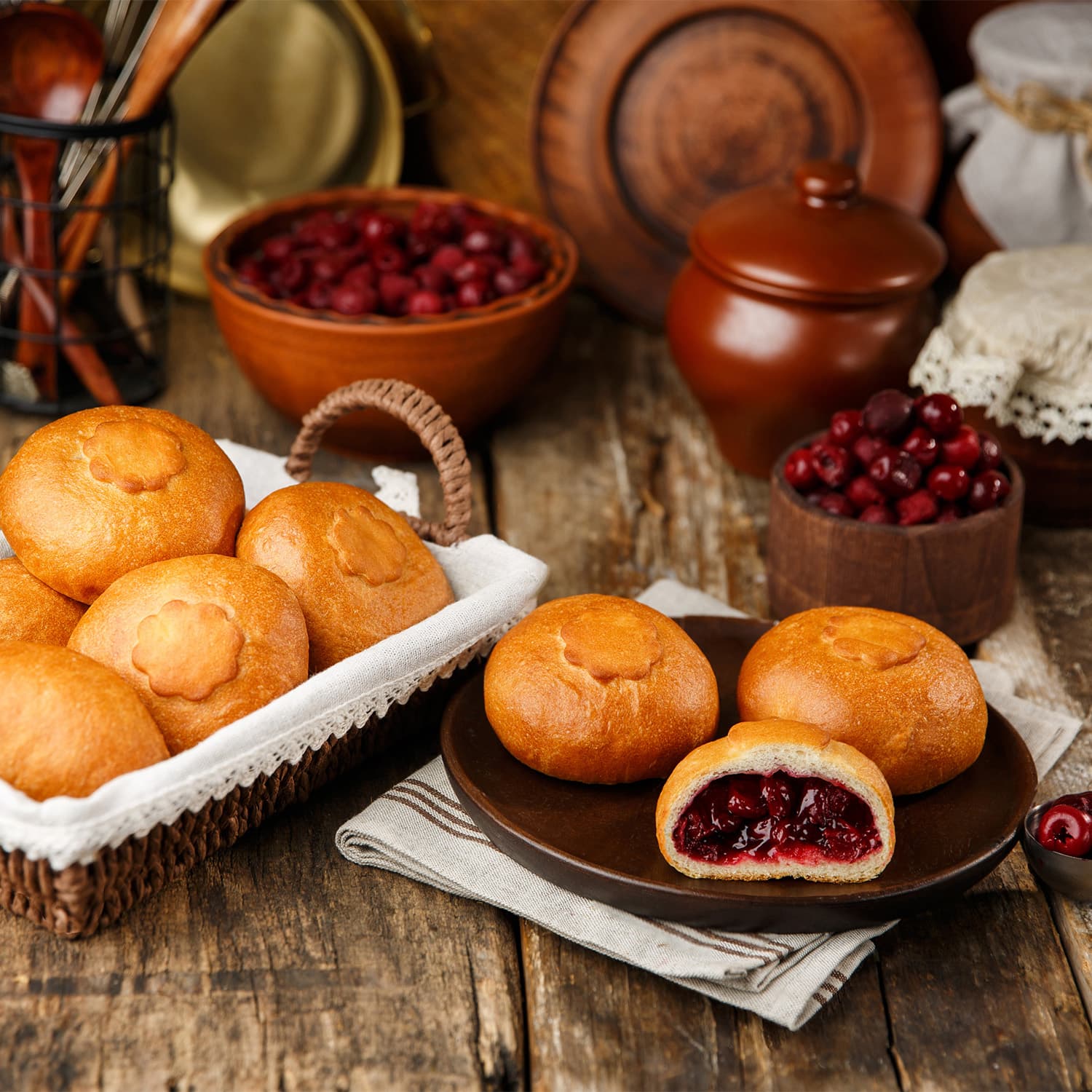 вишня быстрозамороженная, мука пшеничная хлебопекарная высший сорт, вода питьевая, сахар белый, масло оливковое, дрожжи хлебопекарные, соль поваренная пищевая