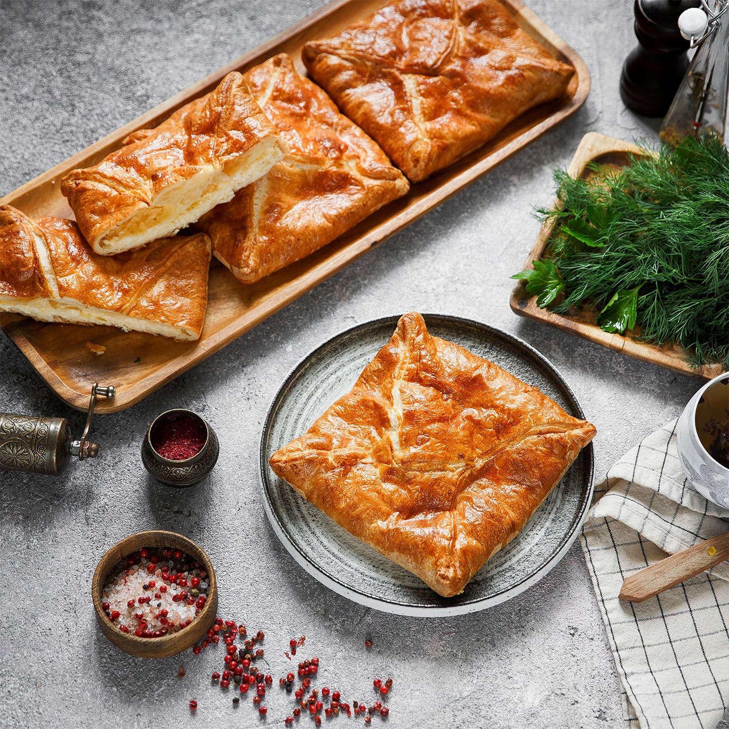 мука пшеничная хлебопекарная высший сорт, сыр Сулугуни, сыр Адыгейский, сыр Брынза, масло сливочное м.д.ж.82,5%, вода питьевая, яйца куриные, молоко питьевое м.д.ж. 3.2%, сахар белый, дрожжи хлебопекарные, соль поваренная пищевая