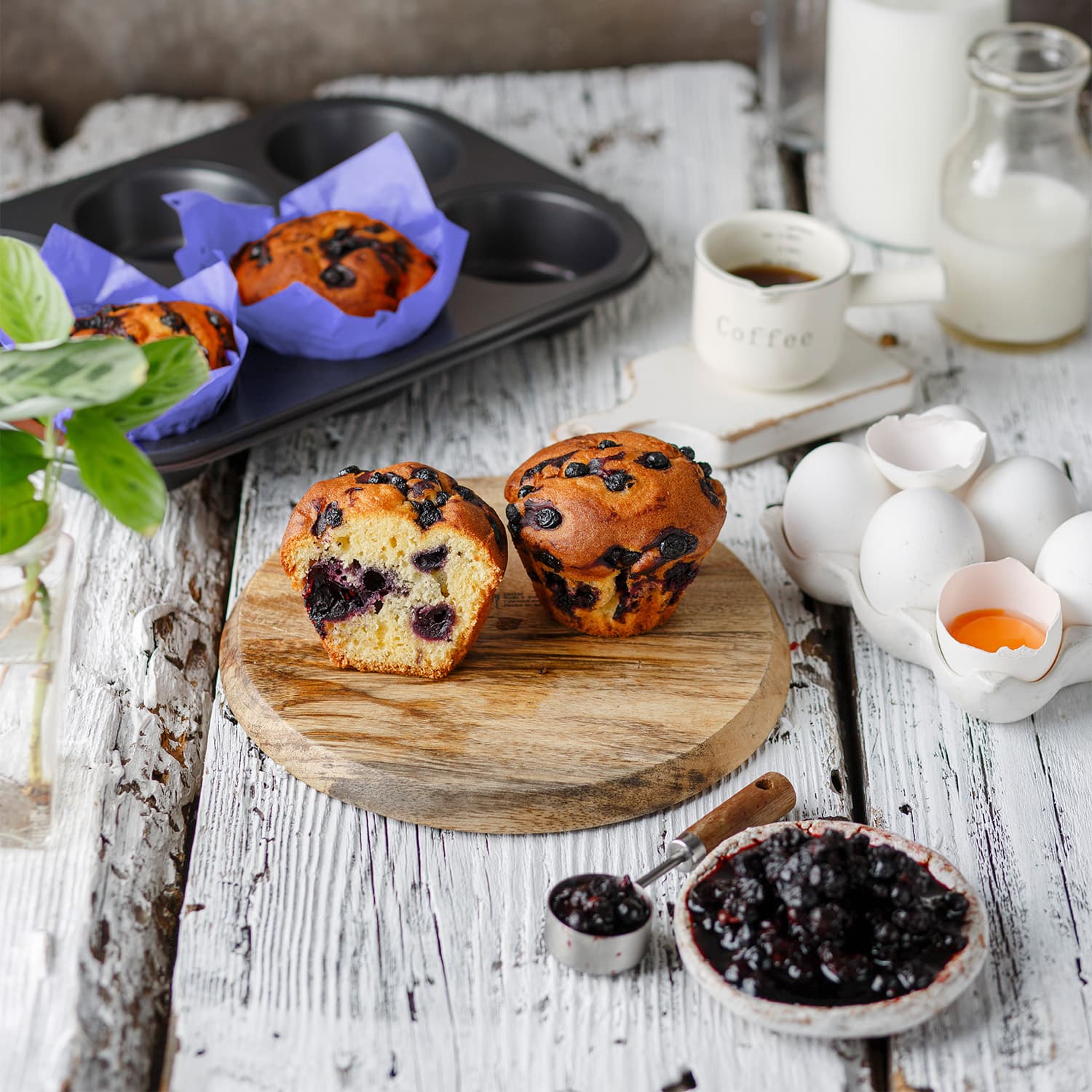 сахар белый, мука пшеничная хлебопекарная высший сорт, черника быстрозамороженная, яйца куриные, вода питьевая, масло сливочное м.д.ж.82,5%, масло подсолнечное рафинированное, крахмал кукурузный, добавка пищевая (гидрокарбонат натрия (сода пищевая)), регулятор кислотности (кислота лимонная)