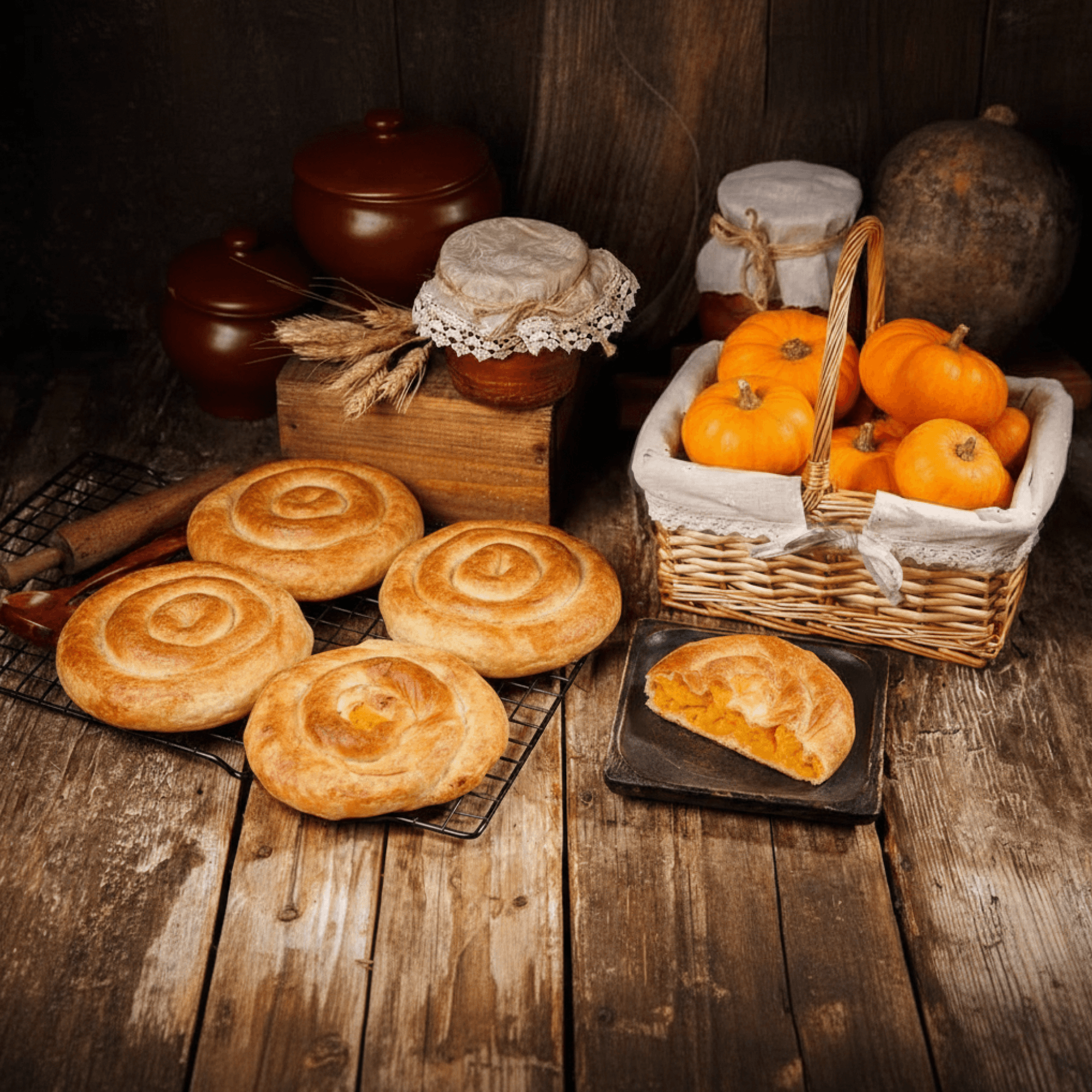 тыква свежая, мука пшеничная хлебопекарная высший сорт, вода питьевая, сахар белый, молоко питьевое м.д.ж. 3.2%, яйца куриные, масло подсолнечное рафинированное, дрожжи хлебопекарные, соль поваренная пищевая