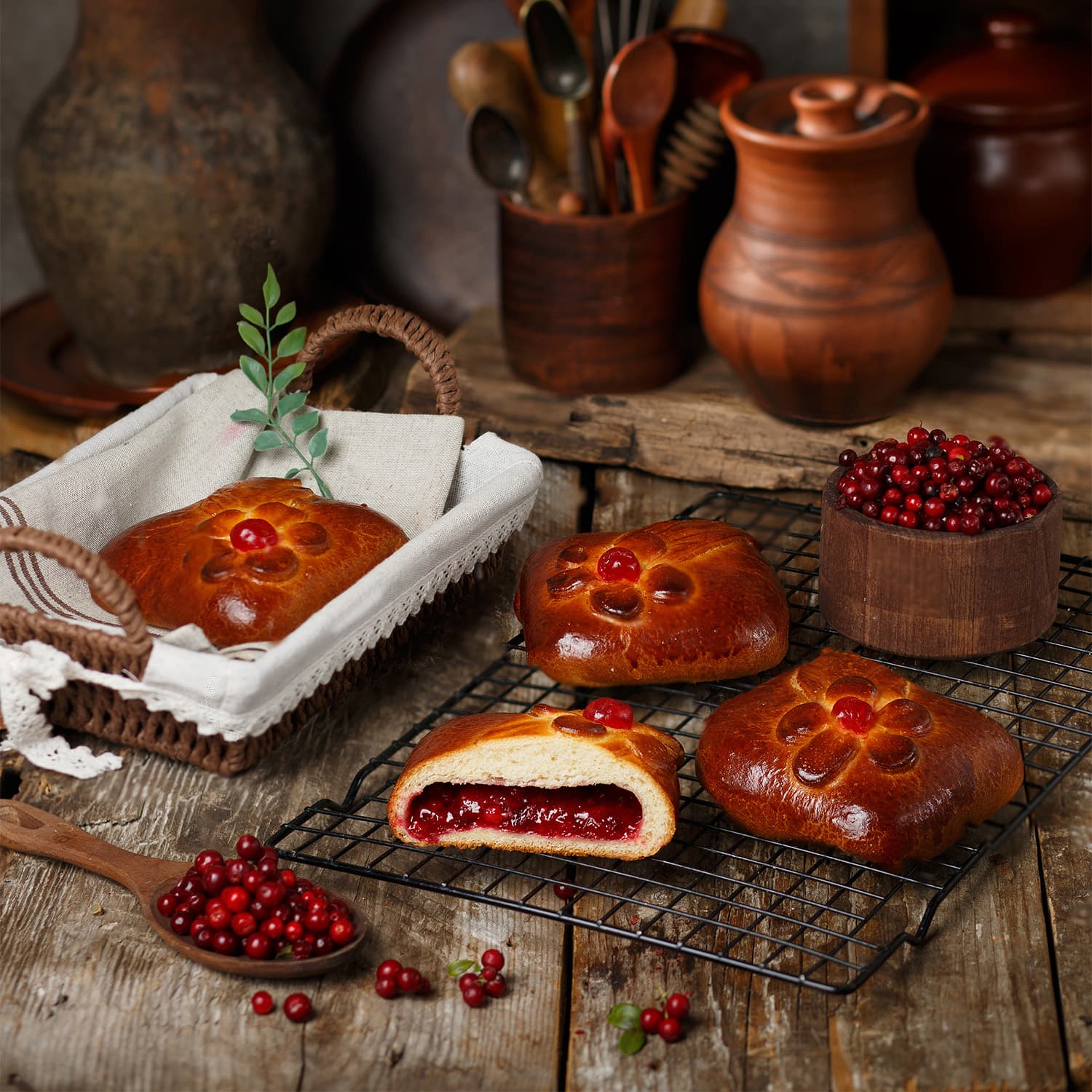 мука пшеничная хлебопекарная высший сорт, брусника быстрозамороженная, сахар белый, молоко питьевое м.д.ж. 3.2%, масло подсолнечное рафинированное, яйца куриные(желтки), масло сливочное м.д.ж.82,5%, мука пшеничная хлебопекарная крупчатка, яйца куриные, дрожжи хлебопекарные, вишня засахаренная, соль поваренная пищевая