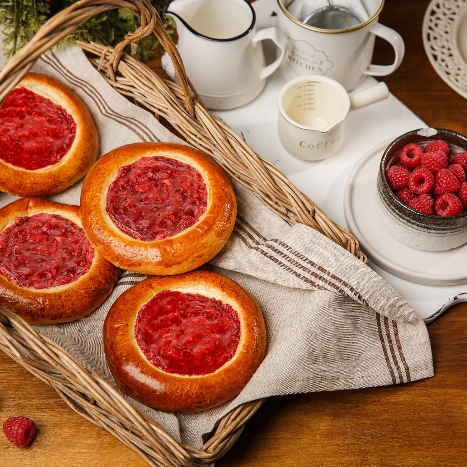 малина быстрозамороженная, мука пшеничная хлебопекарная высший сорт, сахар белый, яйца куриные, масло сливочное м.д.ж.82,5%, молоко питьевое м.д.ж. 3.2%, дрожжи хлебопекарные, масло оливковое, соль поваренная пищевая, ванилин