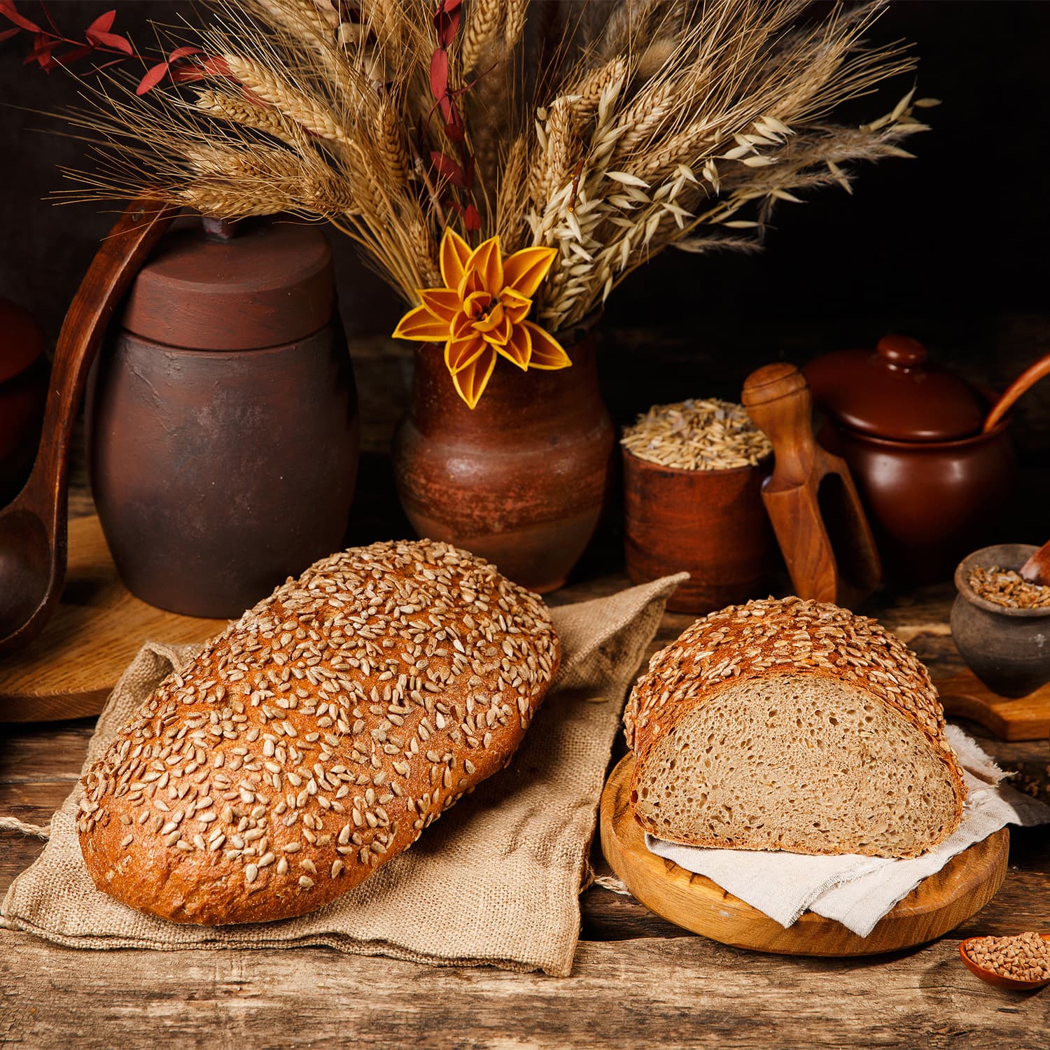 мука пшеничная хлебопекарная высший сорт, вода питьевая, мука пшеничная хлебопекарная первый сорт, семена подсолнечника, мука ржаная хлебопекарная обдирная, мука пшеничная хлебопекарная цельнозерновая, мука гречневая, отруби пшеничные, соль поваренная пищевая, патока мальтозная