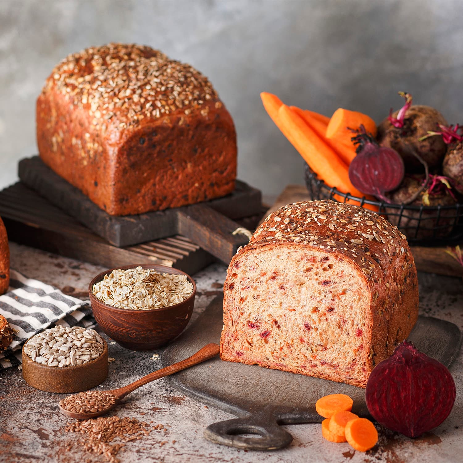 мука пшеничная хлебопекарная высший сорт, вода питьевая, свекла свежая, мука пшеничная хлебопекарная крупчатка, морковь, семена подсолнечника, мука ржаная хлебопекарная обдирная, семена льна, масло подсолнечное рафинированное, соль поваренная пищевая, овсяные хлопья, сахар белый, дрожжи хлебопекарные