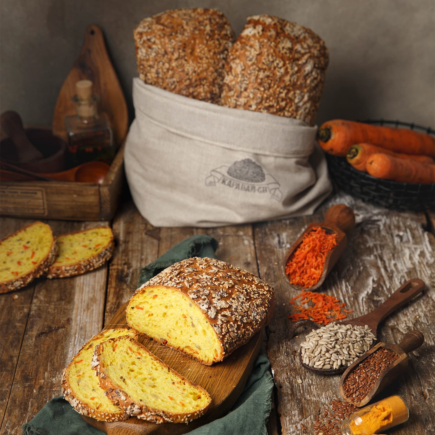 вода питьевая, мука пшеничная хлебопекарная высший сорт, мука пшеничная хлебопекарная крупчатка, семена подсолнечника очищенные, морковь столовая сушёная, мука ржаная хлебопекарная обдирная, масло подсолнечное рафинированное, семена льна, семена кунжута (белый), соль поваренная пищевая, сахар белый, дрожжи хлебопекарные, куркума молотая
