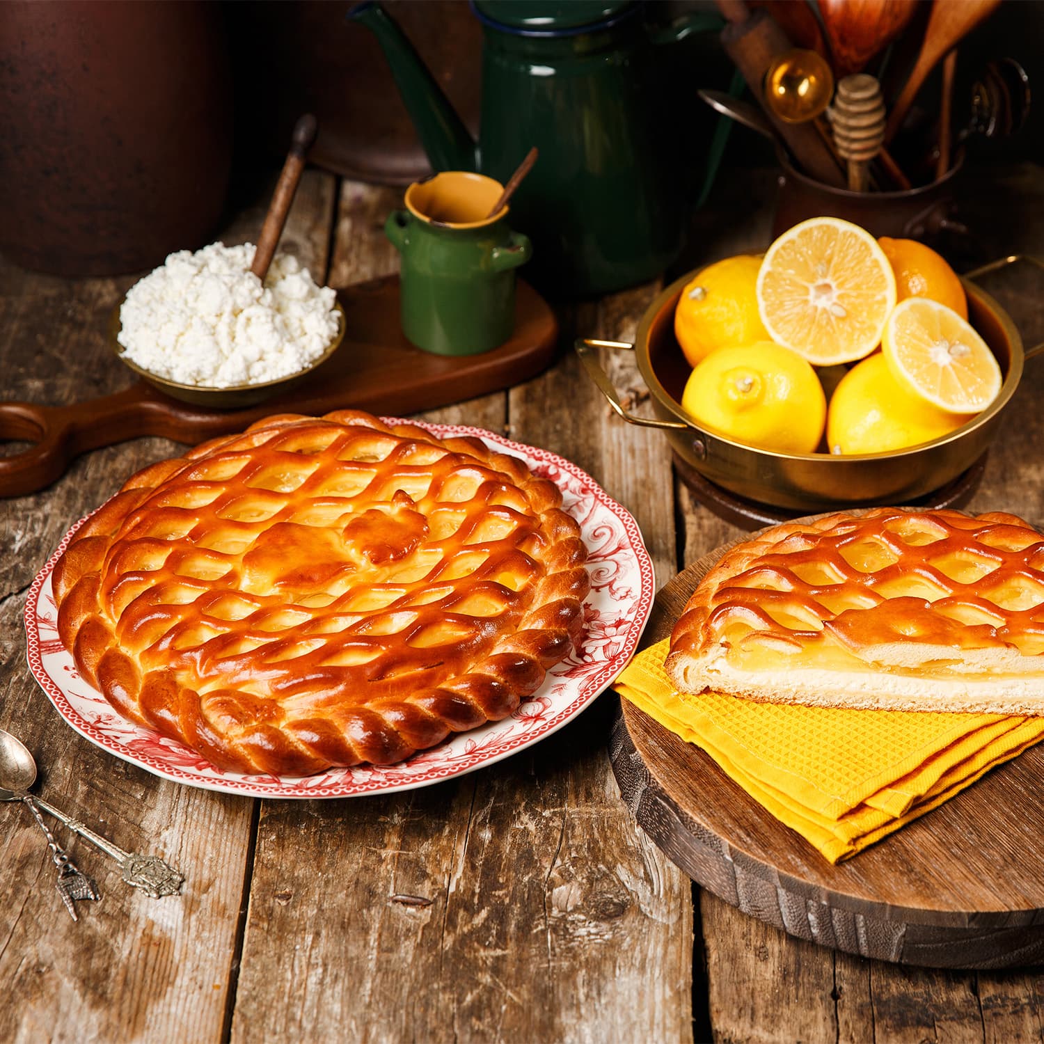 Продукция «Каравай-СВ». Лимонный пирог с творогом — удивительный дуэт цитрусовой яркости и молочной нежности. Круглая форма и красивое ручное плетение по центру, сквозь которое просматривается верхний слой начинки, делают пирог нарядным и оригинальным. Нижний слой — бархатистый творог, верхний — солнечно-желтый лимонный крем с пикантной кислинкой. Воздушное тесто на топленом молоке и сливочном масле создает идеальную текстуру. Аромат ванили добавляет теплые гурманские нотки, а лимонная свежесть пробуждает аппетит. Этот пирог станет восхитительным завершением обеда, изюминкой чаепития или элегантным десертом для особого случая.