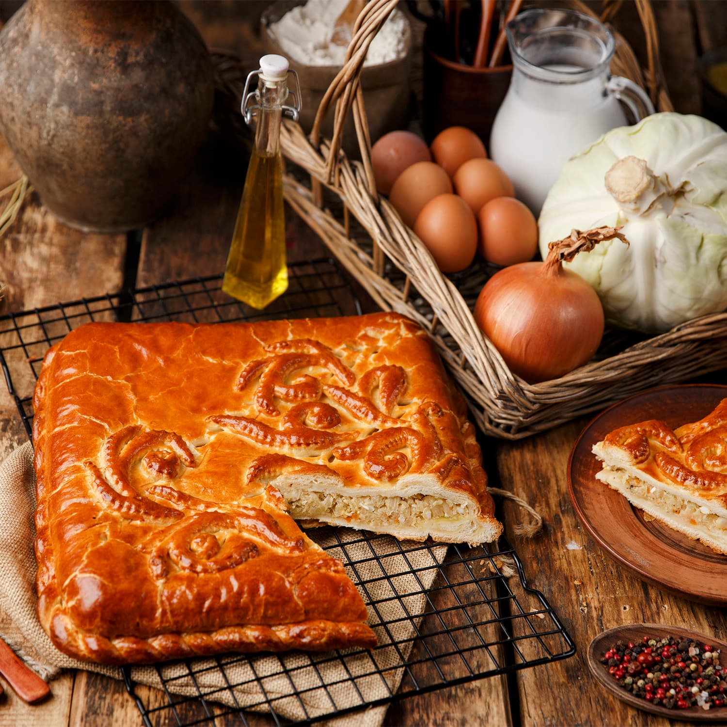 Продукция «Каравай-СВ». Позвольте себе насладиться домашним уютом с пирогом «Русские узоры» с нежной капустой. Под румяной корочкой, дополненной изящным рельефным узором и обрамленной золотистой плетеной косичкой, спрятана сочная томленая начинка из свежей капусты с лучком. Каждая порция этой традиционной выпечки дарит гармонию слегка сладковатых нот овощей и легкой пикантности черного перца. Воздушное сдобное тесто на сливочном масле, сметане и молоке идеально сочетается с аппетитной сердцевиной. Квадратный пирог весом 1 кг станет прекрасным компаньоном основных блюд для перекуса на работе или семейном обеде.