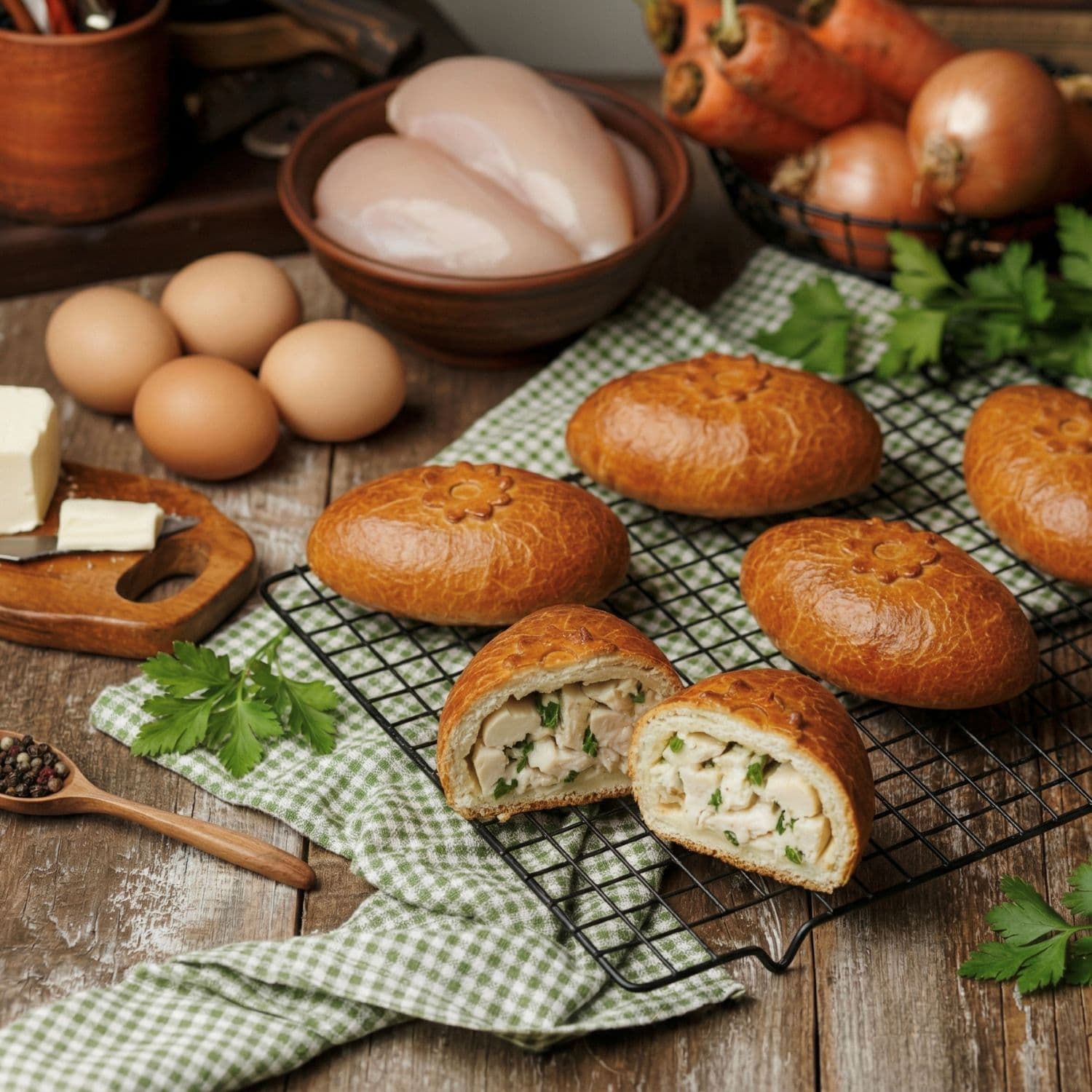 мясо кур (филе), мука пшеничная хлебопекарная высший сорт, масло сливочное м.д.ж.82,5%, лук репчатый, яйца куриные(желтки), молоко питьевое м.д.ж.3,2%, сметана м.д.ж.20%, сахар белый, масло подсолнечное рафинированное, соль пищевая, петрушка свежая, дрожжи хлебопекарные, перец черный
