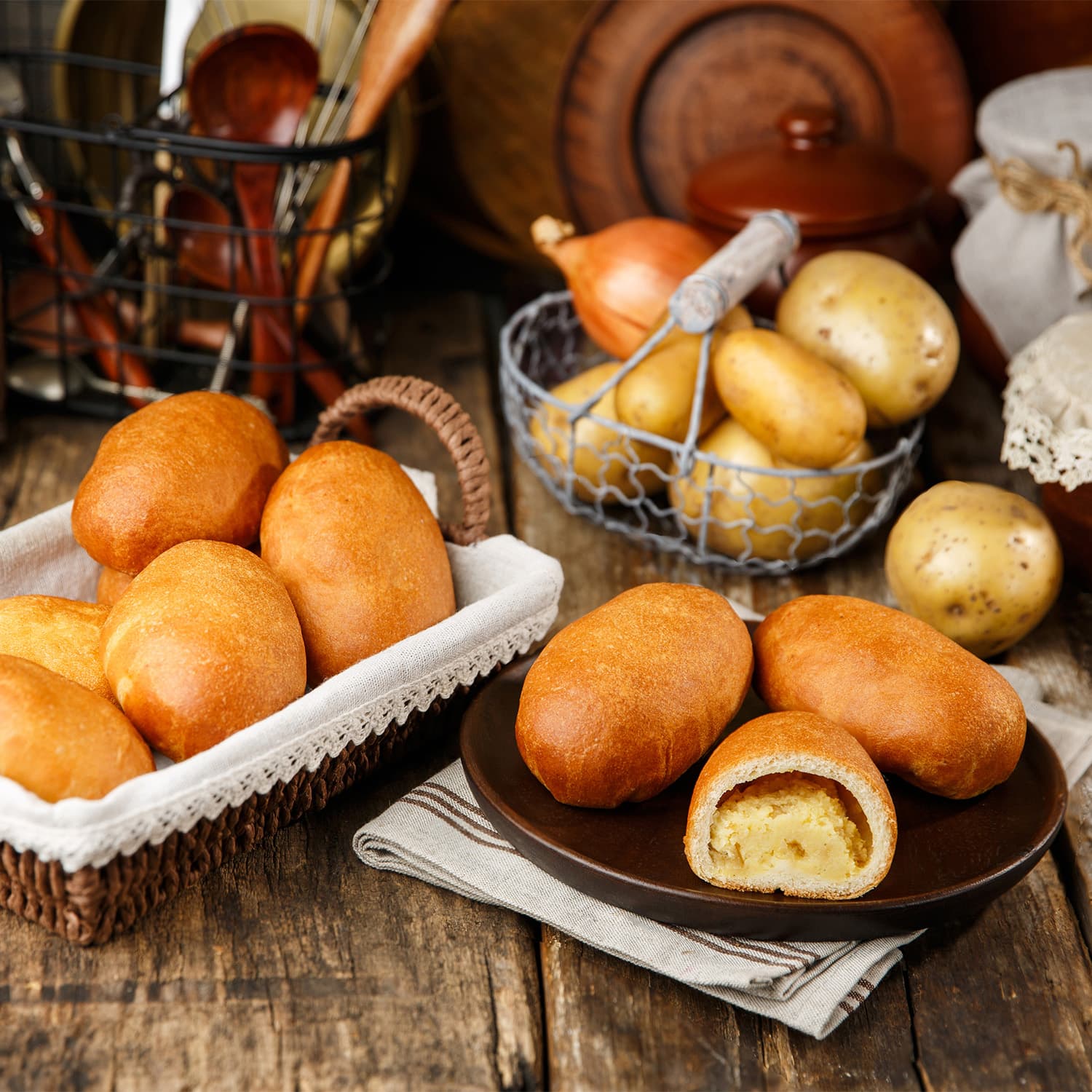 картофель свежий, мука пшеничная хлебопекарная высший сорт, вода питьевая, лук репчатый, сахар белый, масло подсолнечное рафинированное, масло оливковое, дрожжи хлебопекарные, соль поваренная пищевая, перец черный