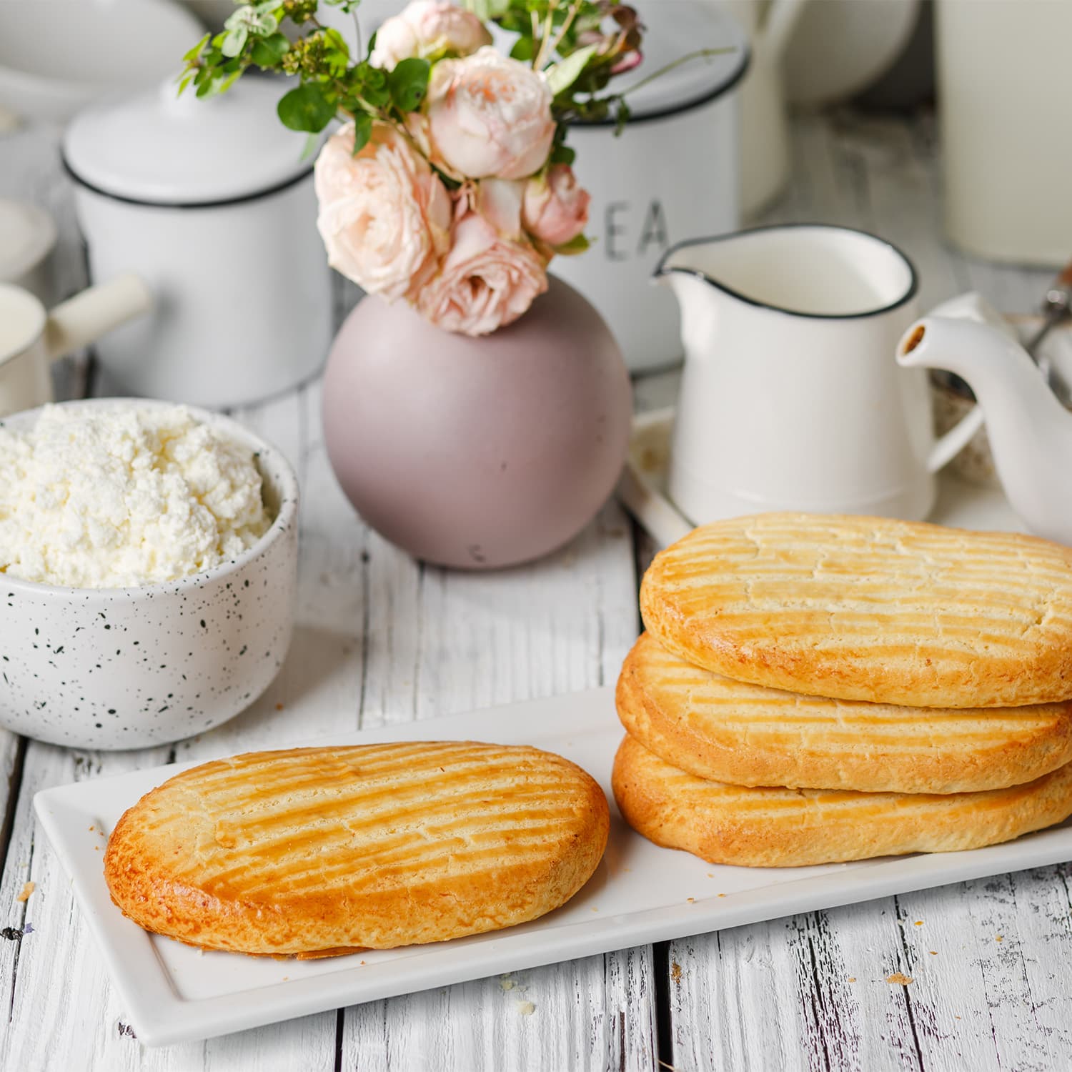 мука пшеничная хлебопекарная высший сорт, сахар белый, масло сливочное м.д.ж.82,5%, творог м.д.ж.9%, яйца куриные, соль поваренная пищевая, добавка пищевая (гидрокарбонат натрия (сода пищевая)), добавка пищевая(гидрокарбонат аммония)