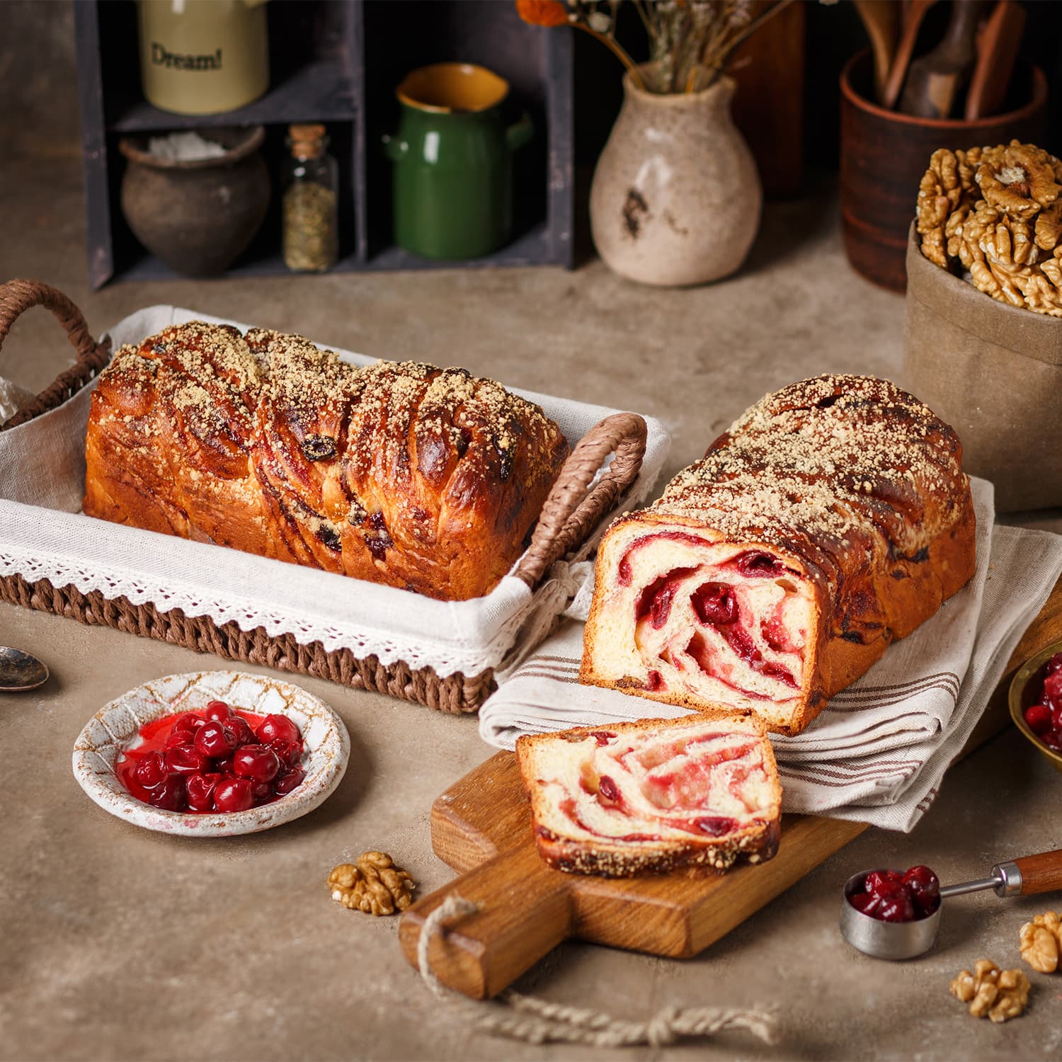 мука пшеничная хлебопекарная высший сорт, начинка вишнёвая (вишня, сахар, крахмал кукурузный, регулятор кислотности (лимонная кислота), ароматизатор "Вишня"), сахар белый, вишня быстрозамороженная, молоко питьевое м.д.ж. 3.2%, масло сливочное м.д.ж.82,5%, яйца куриные, орех грецкий, вода питьевая, дрожжи хлебопекарные, мука пшеничная хлебопекарная крупчатка, масло подсолнечное рафинированное, соль поваренная пищевая, ванилин, шафран