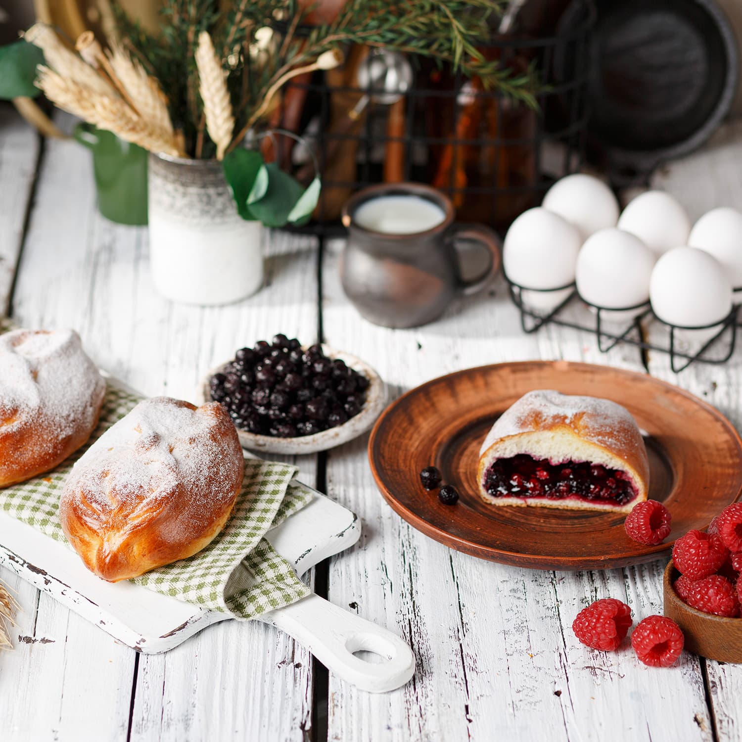 мука пшеничная хлебопекарная высший сорт, сахар белый, молоко питьевое м.д.ж. 3.2%, брусника быстрозамороженная, яйца куриные, черника быстрозамороженная, малина быстрозамороженная, масло сливочное м.д.ж.82,5%, красная смородина быстрозамороженная, дрожжи хлебопекарные, соль поваренная пищевая, ванилин